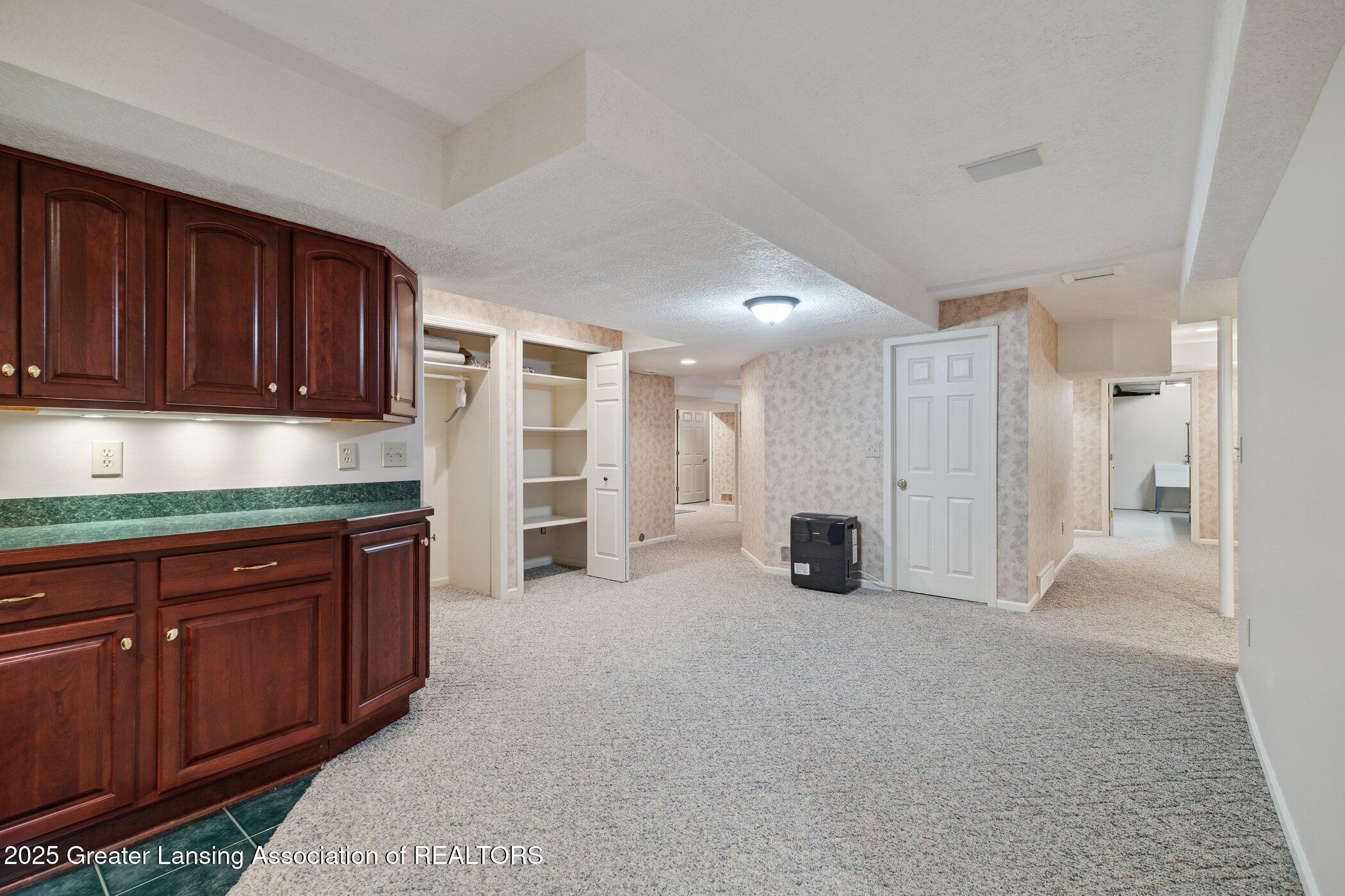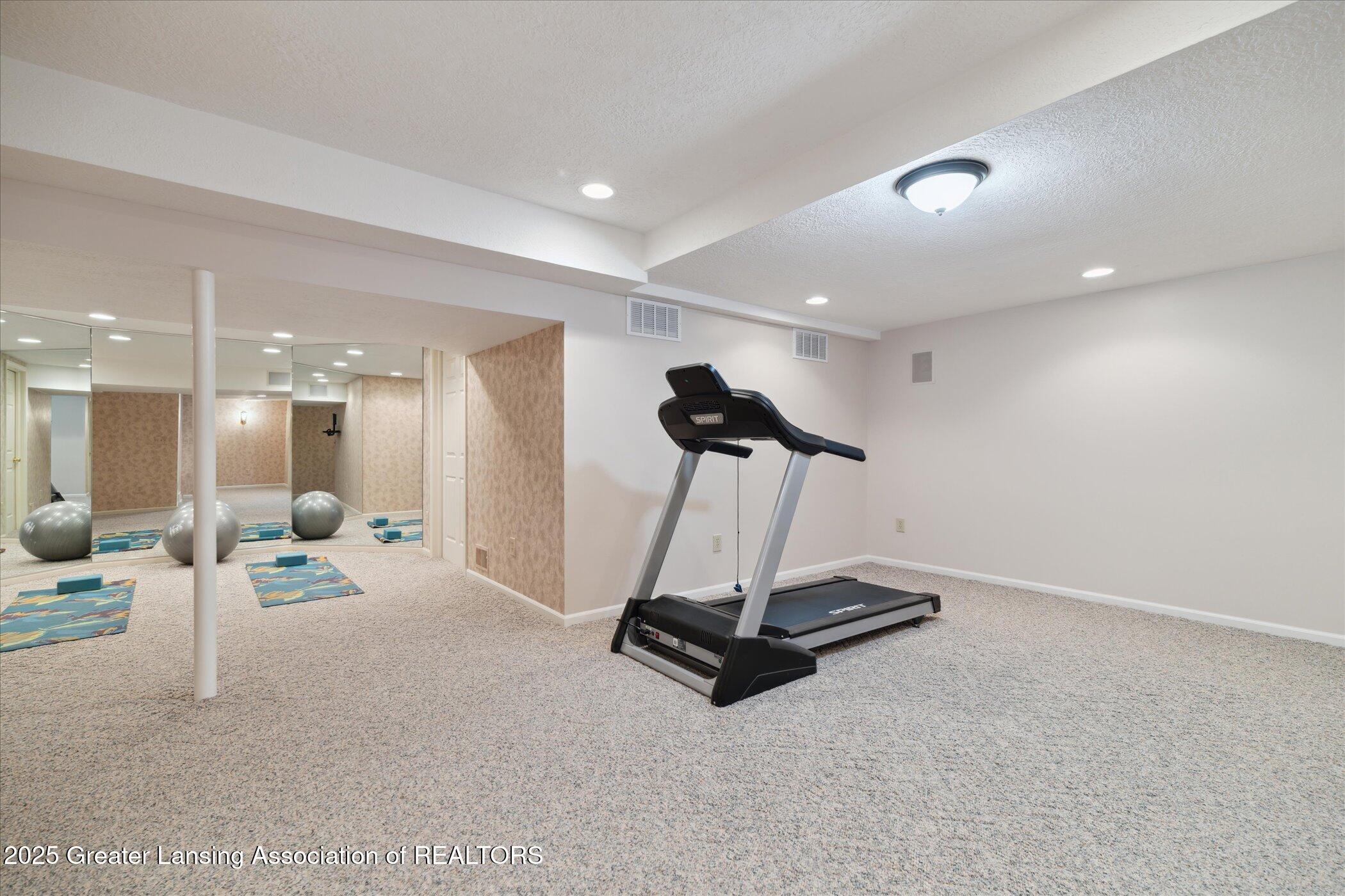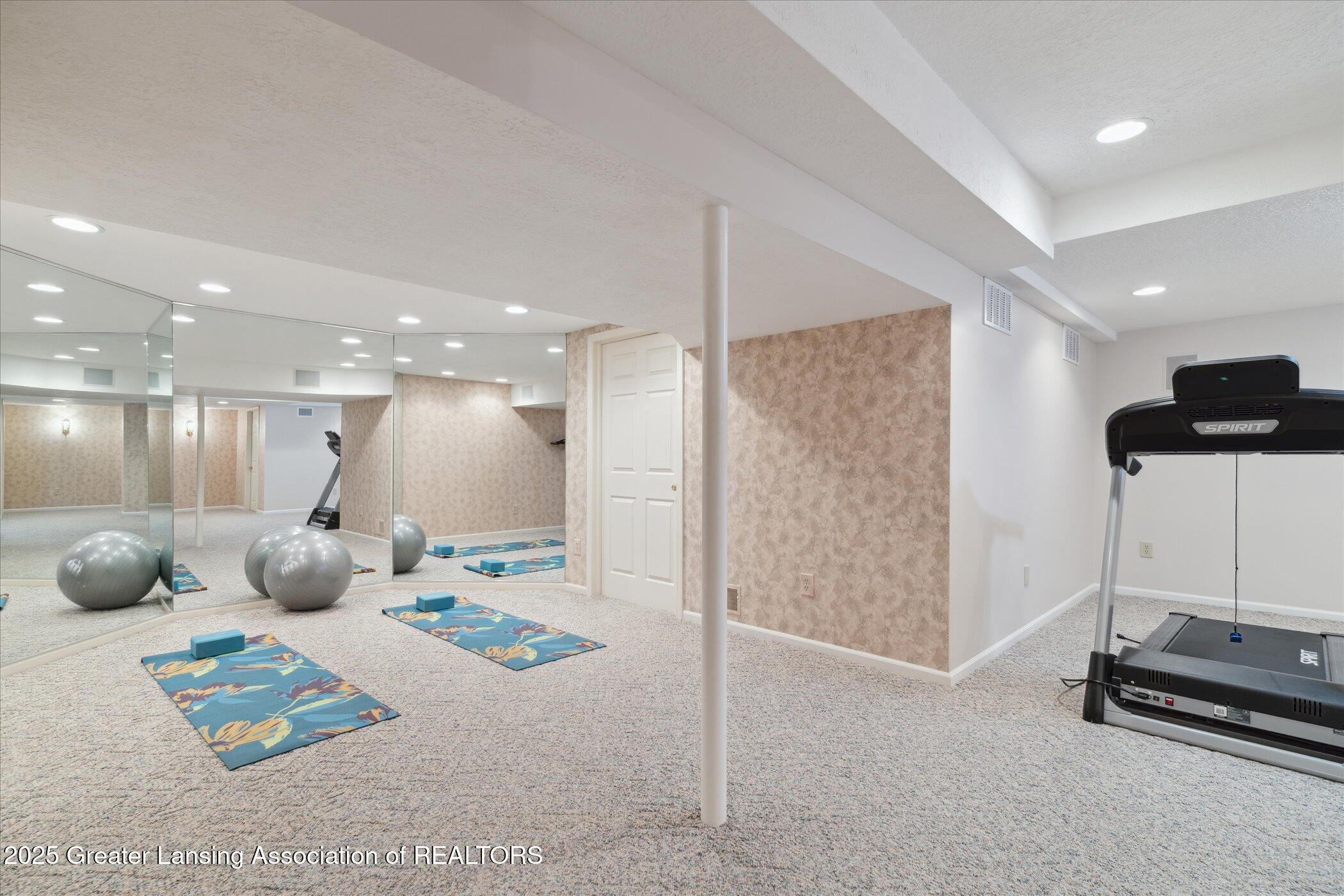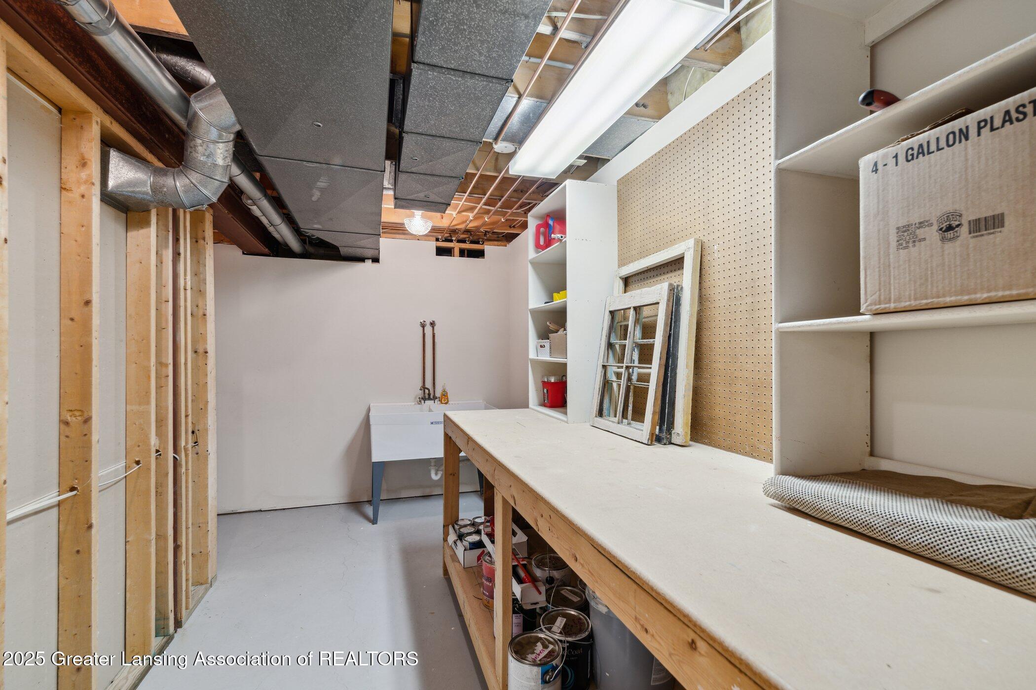 Huge basement: built-in entertainment, bar, fridge, sink, dishwasher, dining area, three large closets with shelves, another large room (for exercise equipment, a theater, or pool table), a half-octagon room with full wall mirrors on 3 sides, full bath, two storage rooms, workshop, workbench/utility sink.