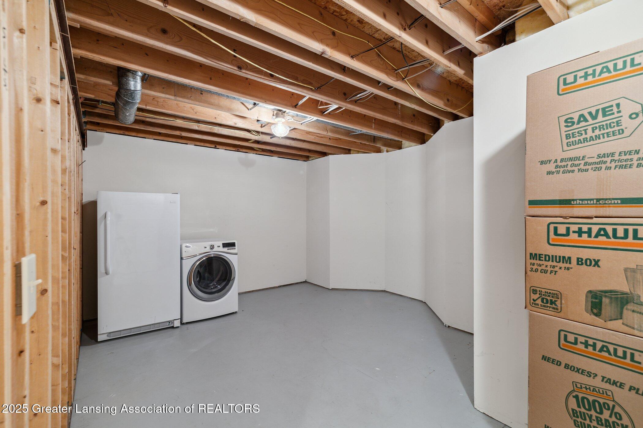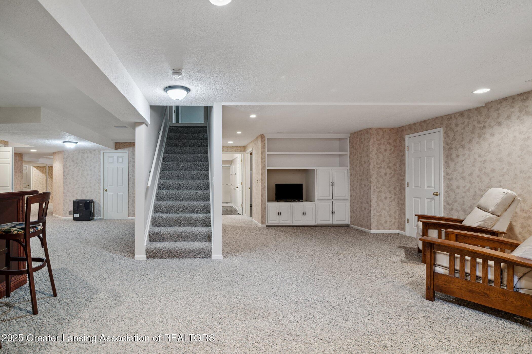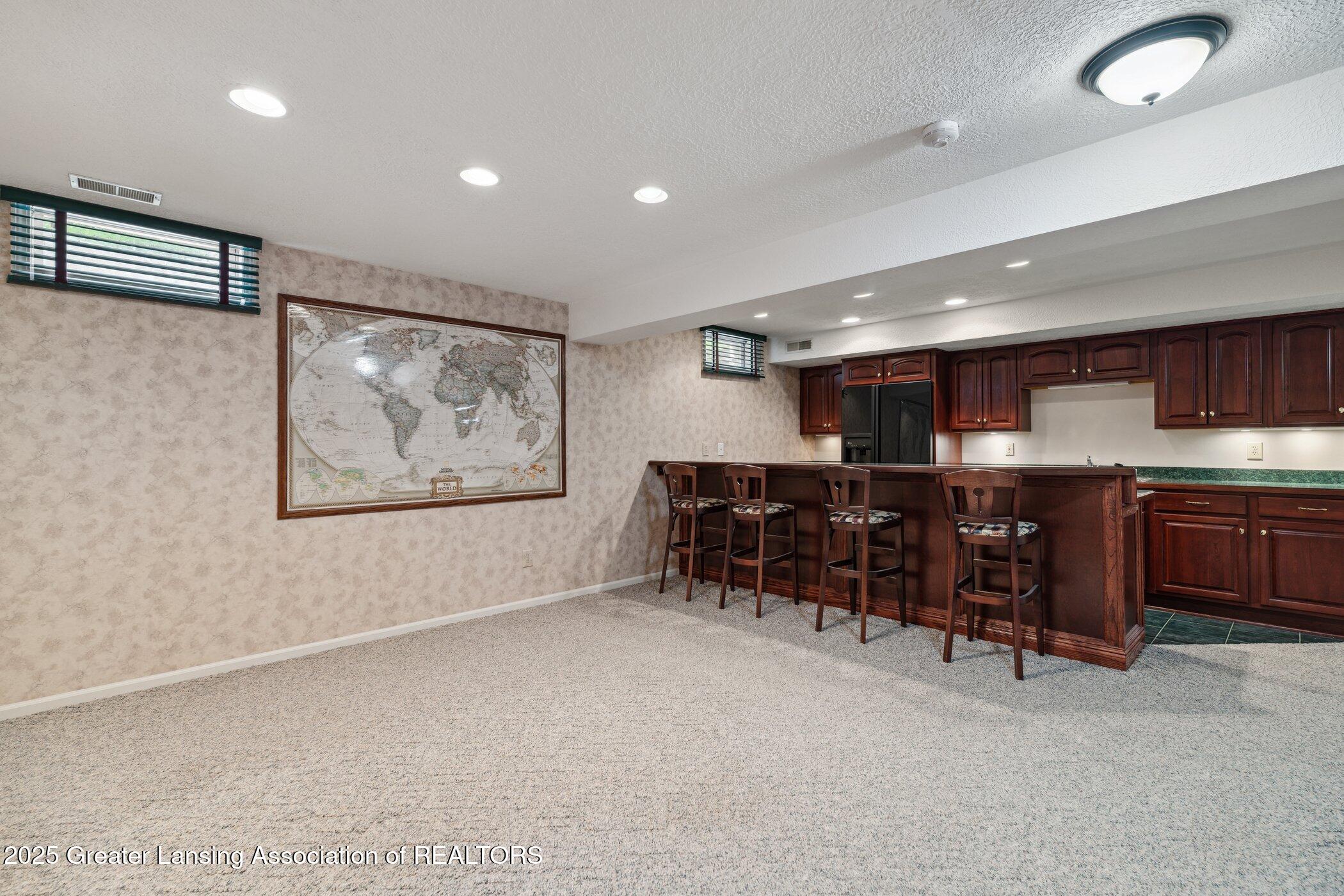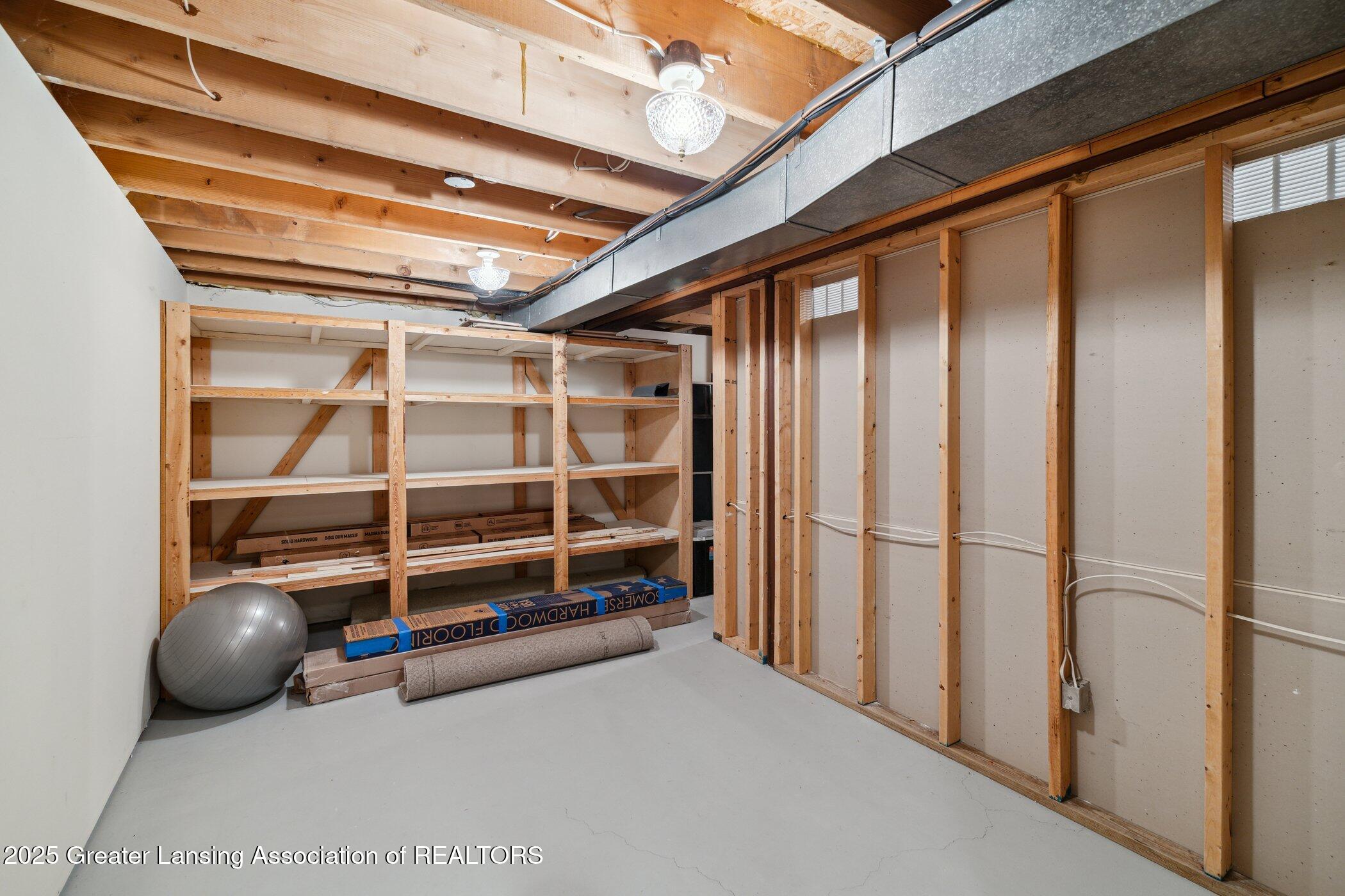 Huge basement: built-in entertainment, bar, fridge, sink, dishwasher, dining area, three large closets with shelves, another large room (for exercise equipment, a theater, or pool table), a half-octagon room with full wall mirrors on 3 sides, full bath, two storage rooms, workshop, workbench/utility sink.