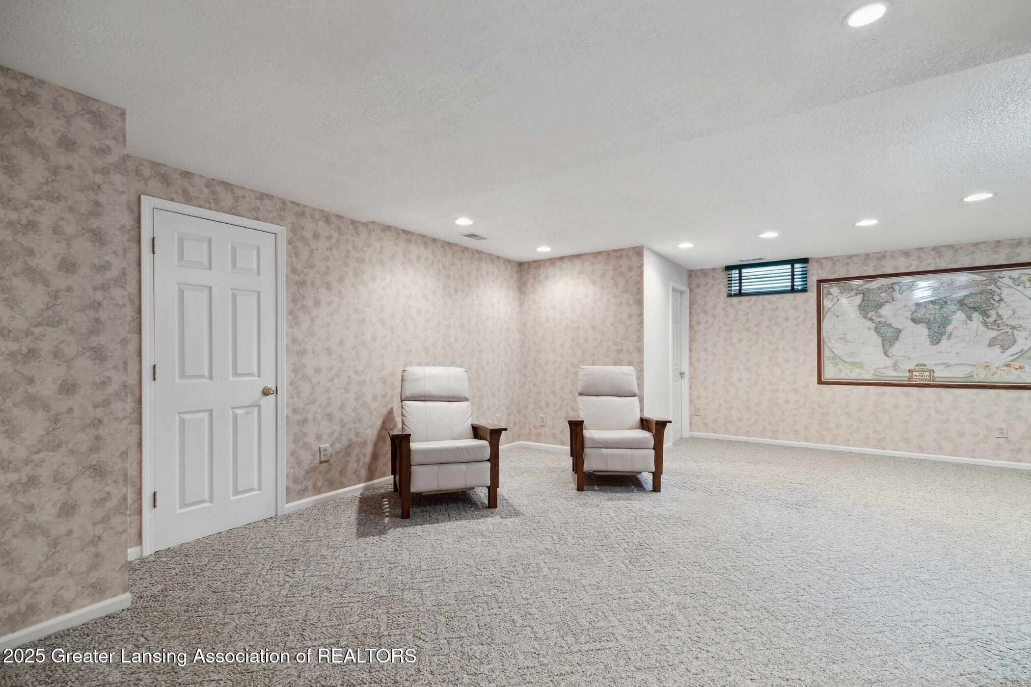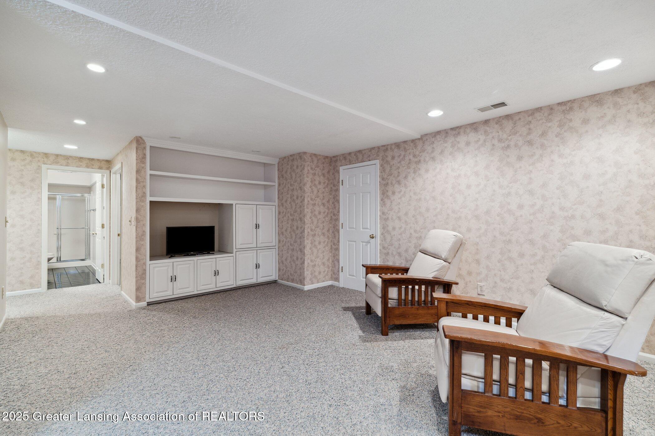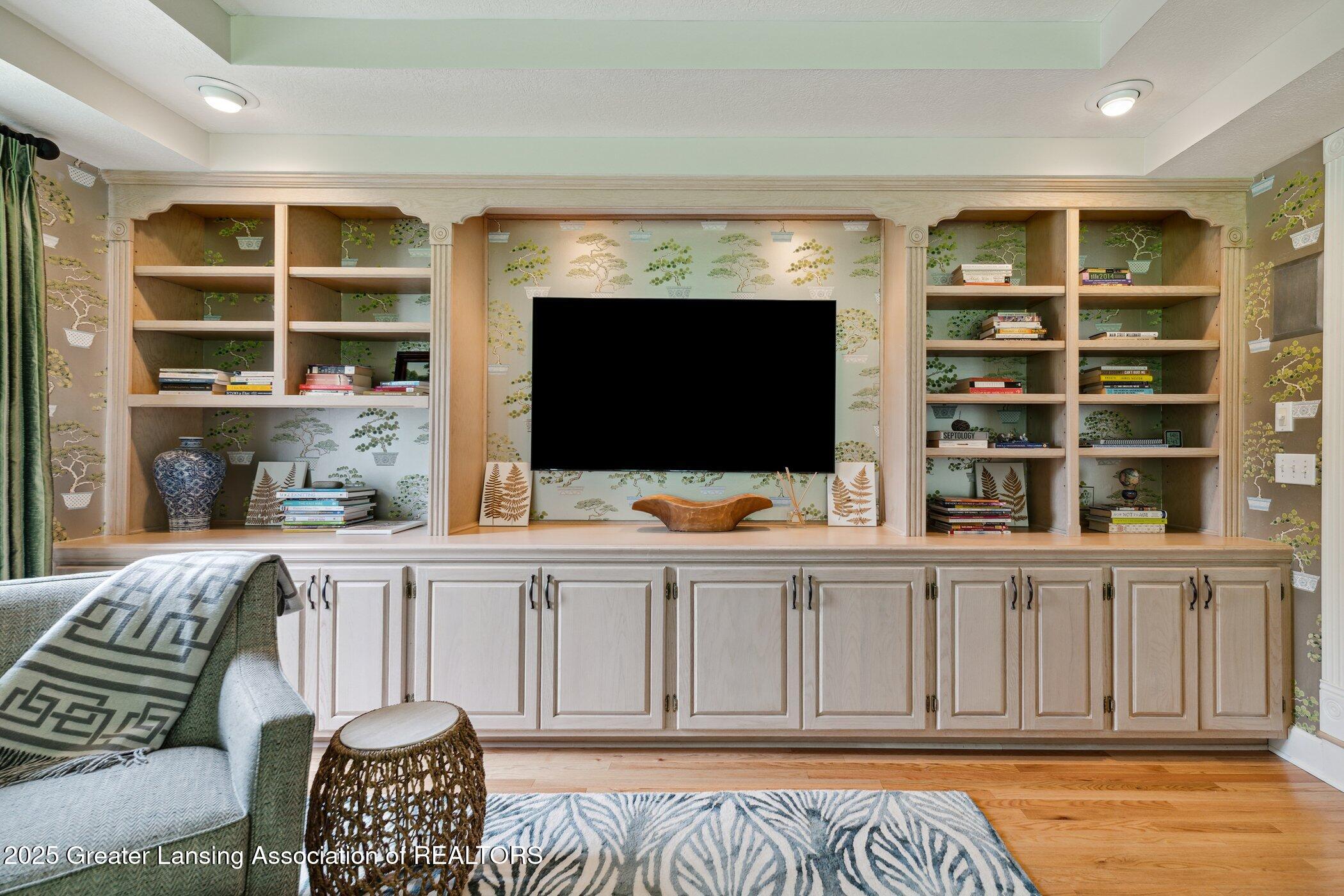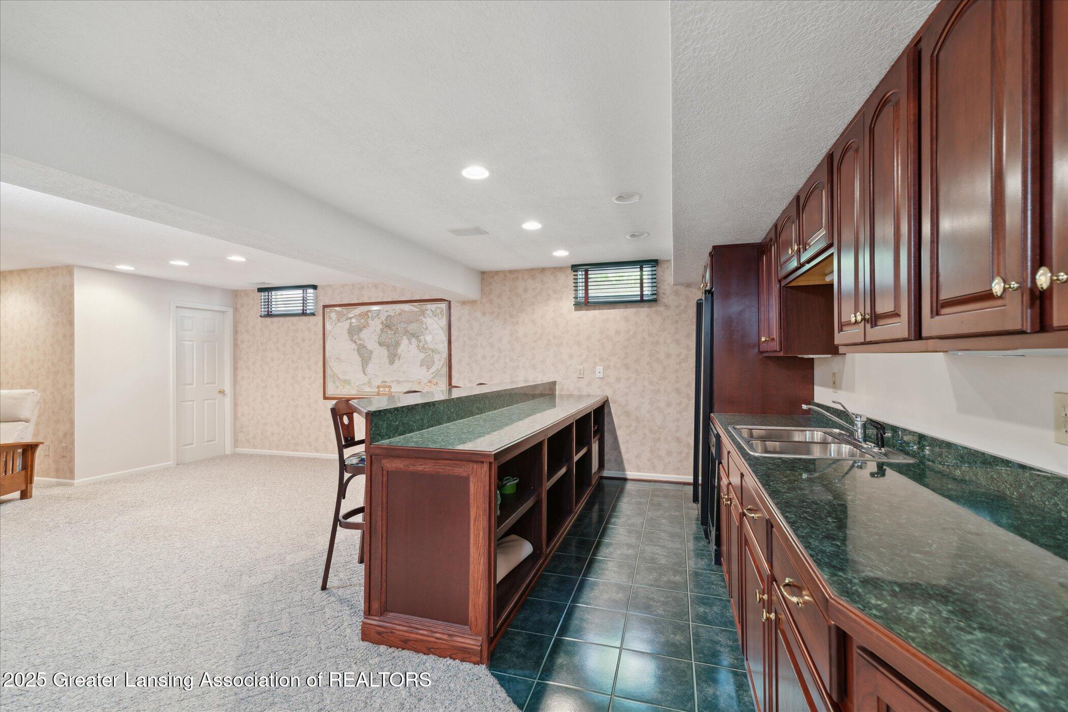 Huge basement: built-in entertainment, bar, fridge, sink, dishwasher, dining area, three large closets with shelves, another large room (for exercise equipment, a theater, or pool table), a half-octagon room with full wall mirrors on 3 sides, full bath, two storage rooms, workshop, workbench/utility sink.
