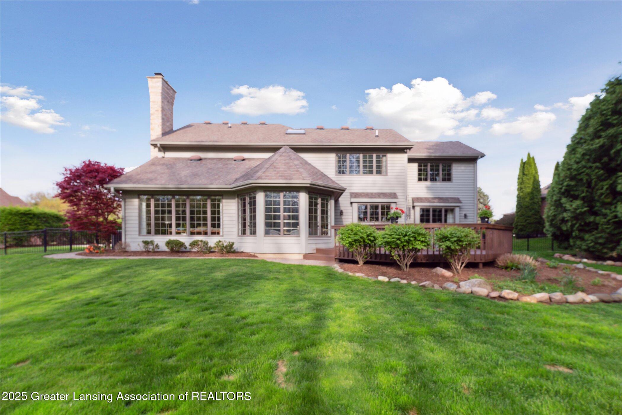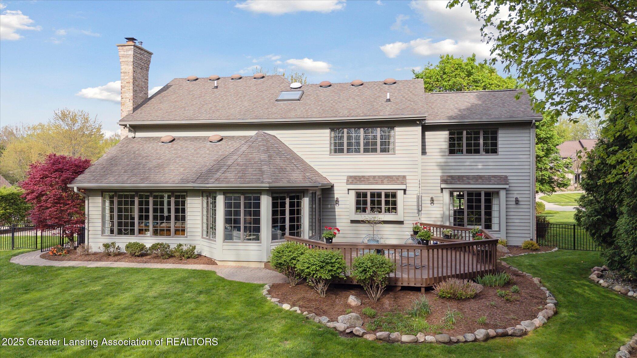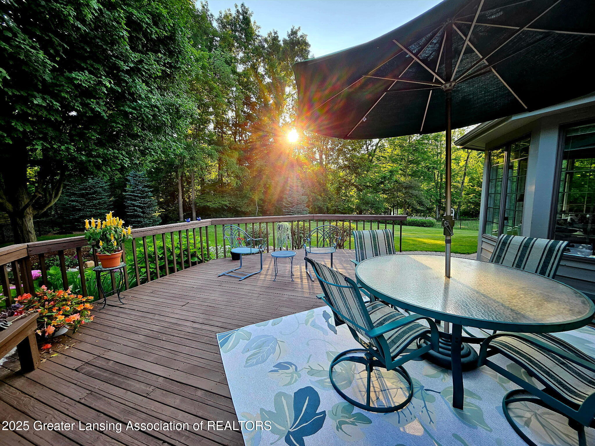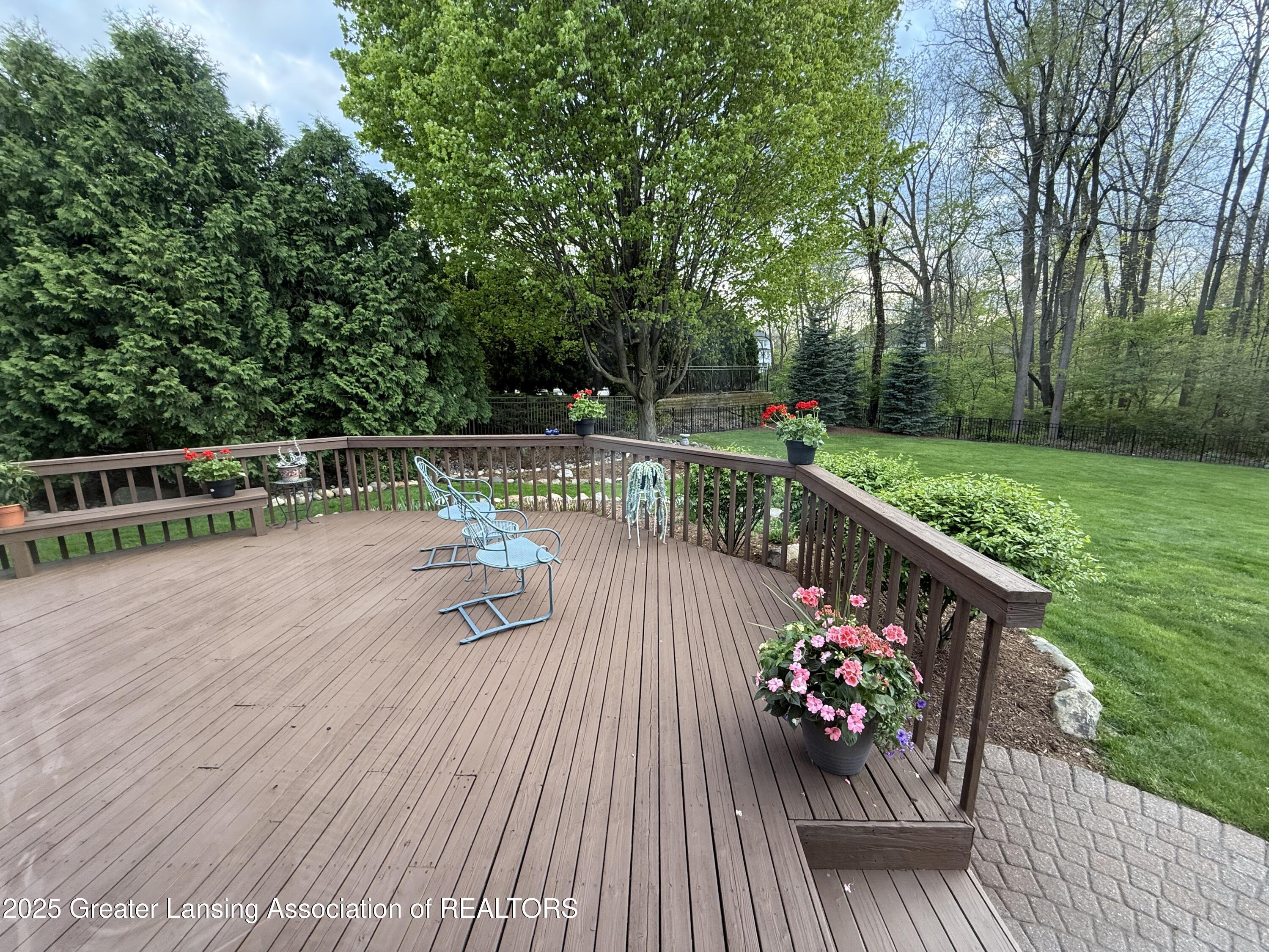 Kitchen opens to informal dining, wet bar, four-seasons room with soaring ceiling and bright light all day, and family room. Family room has custom built-ins, brick fireplace, coved ceiling, custom silk blinds/curtains. Large deck overlooks fully fenced private yard.