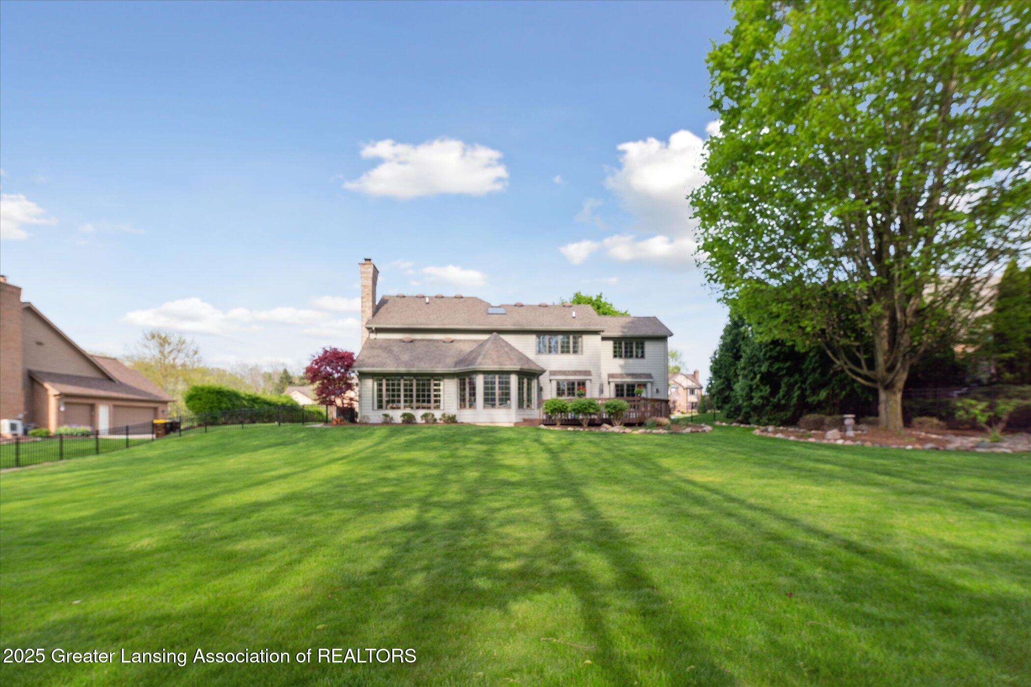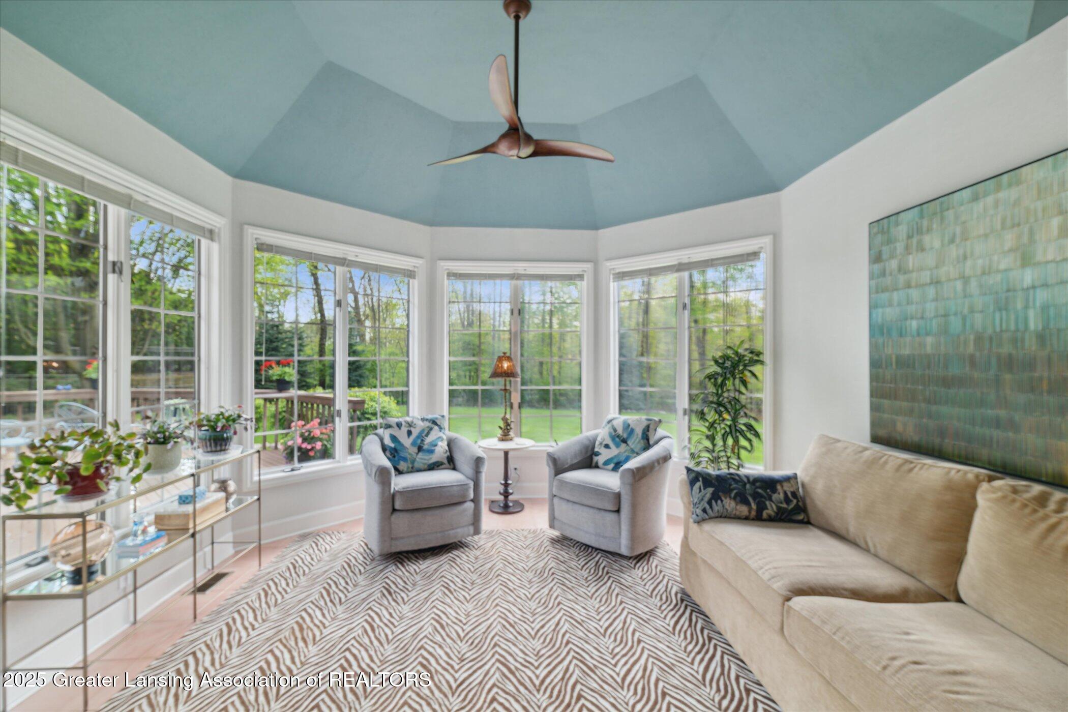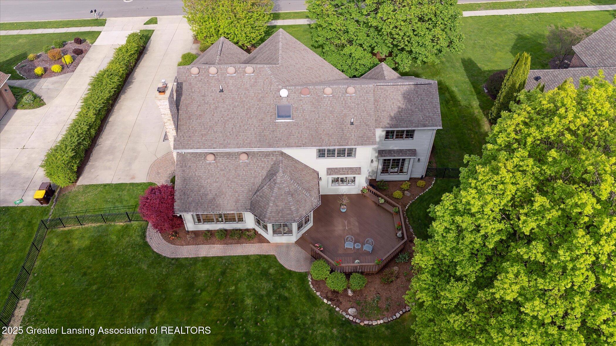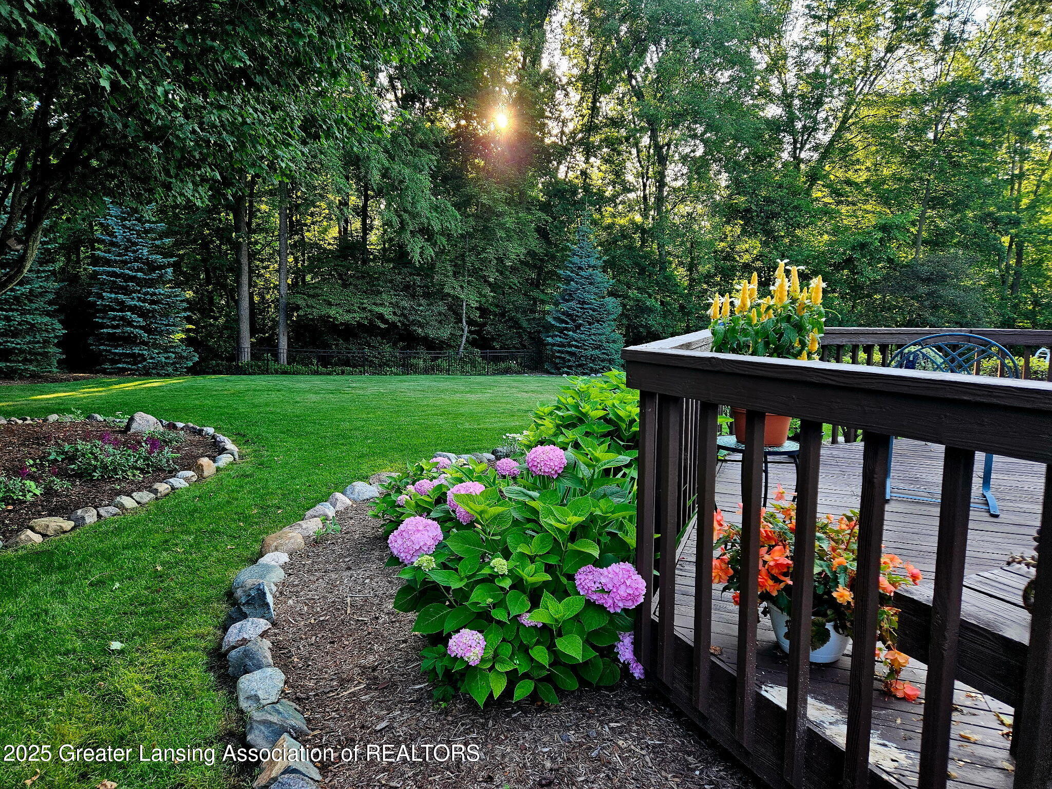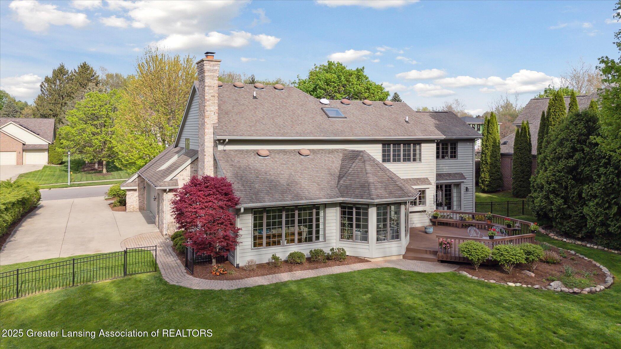 Kitchen opens to informal dining, wet bar, four-seasons room with soaring ceiling and bright light all day, and family room. Family room has custom built-ins, brick fireplace, coved ceiling, custom silk blinds/curtains. Large deck overlooks fully fenced private yard.