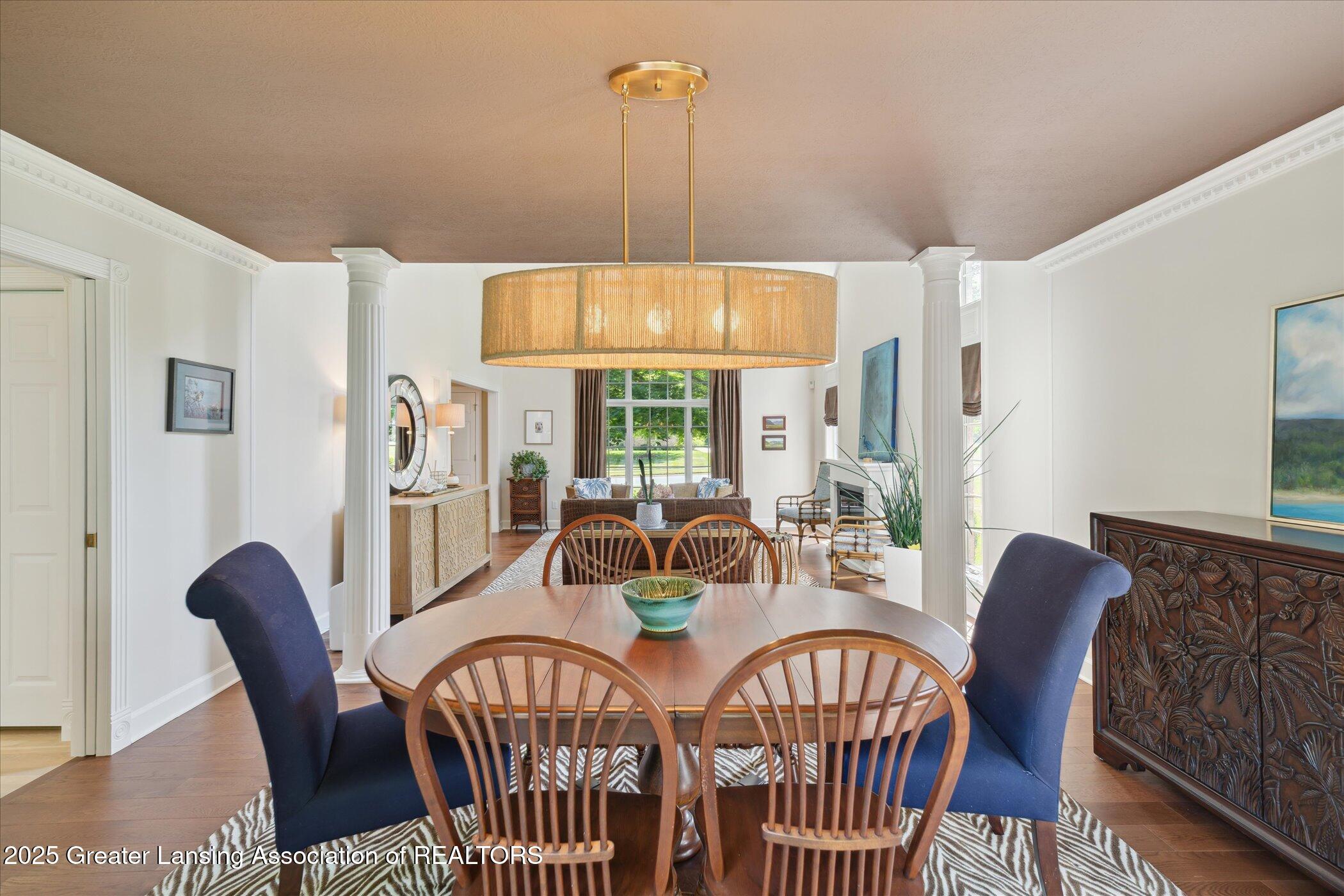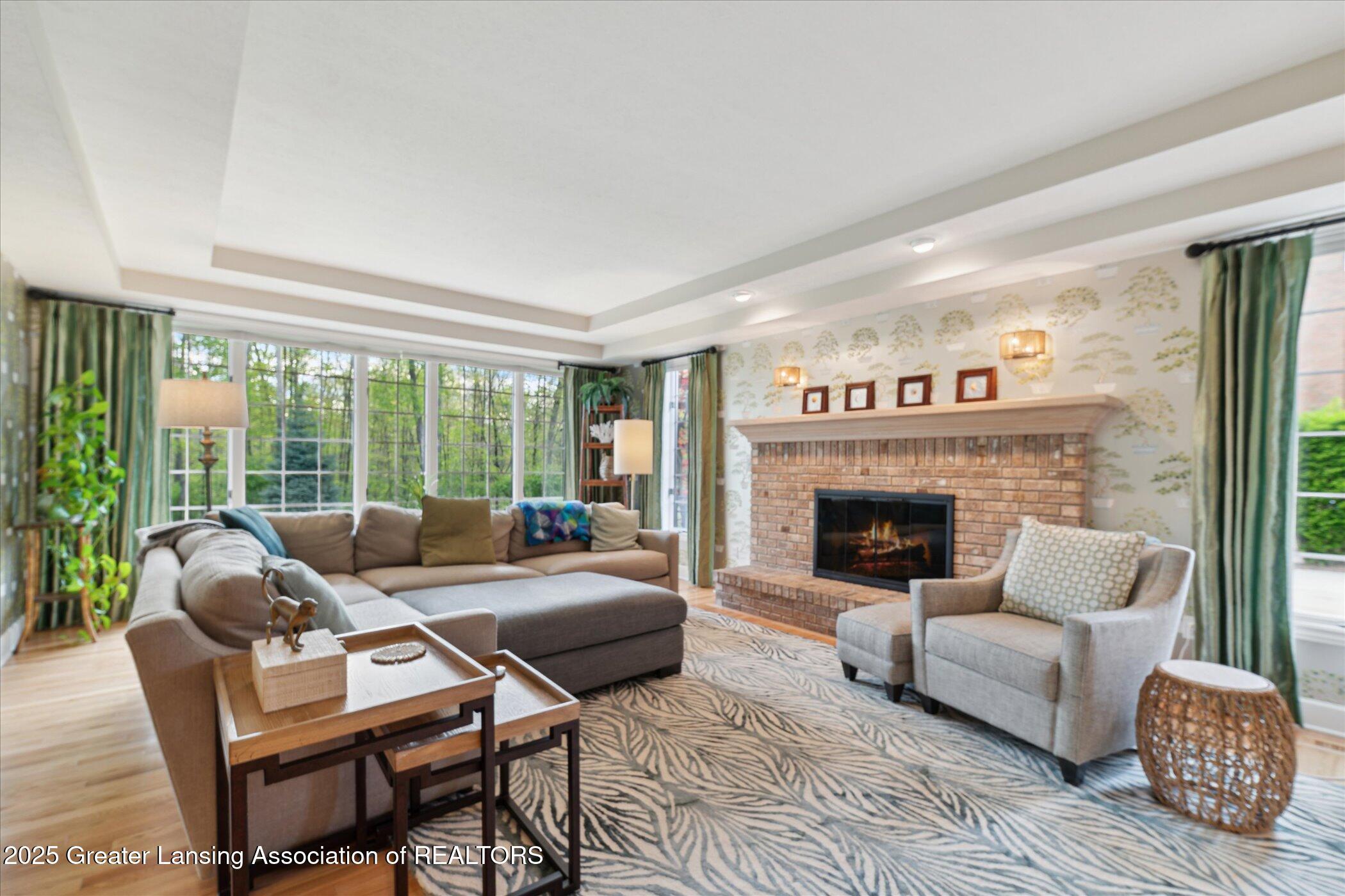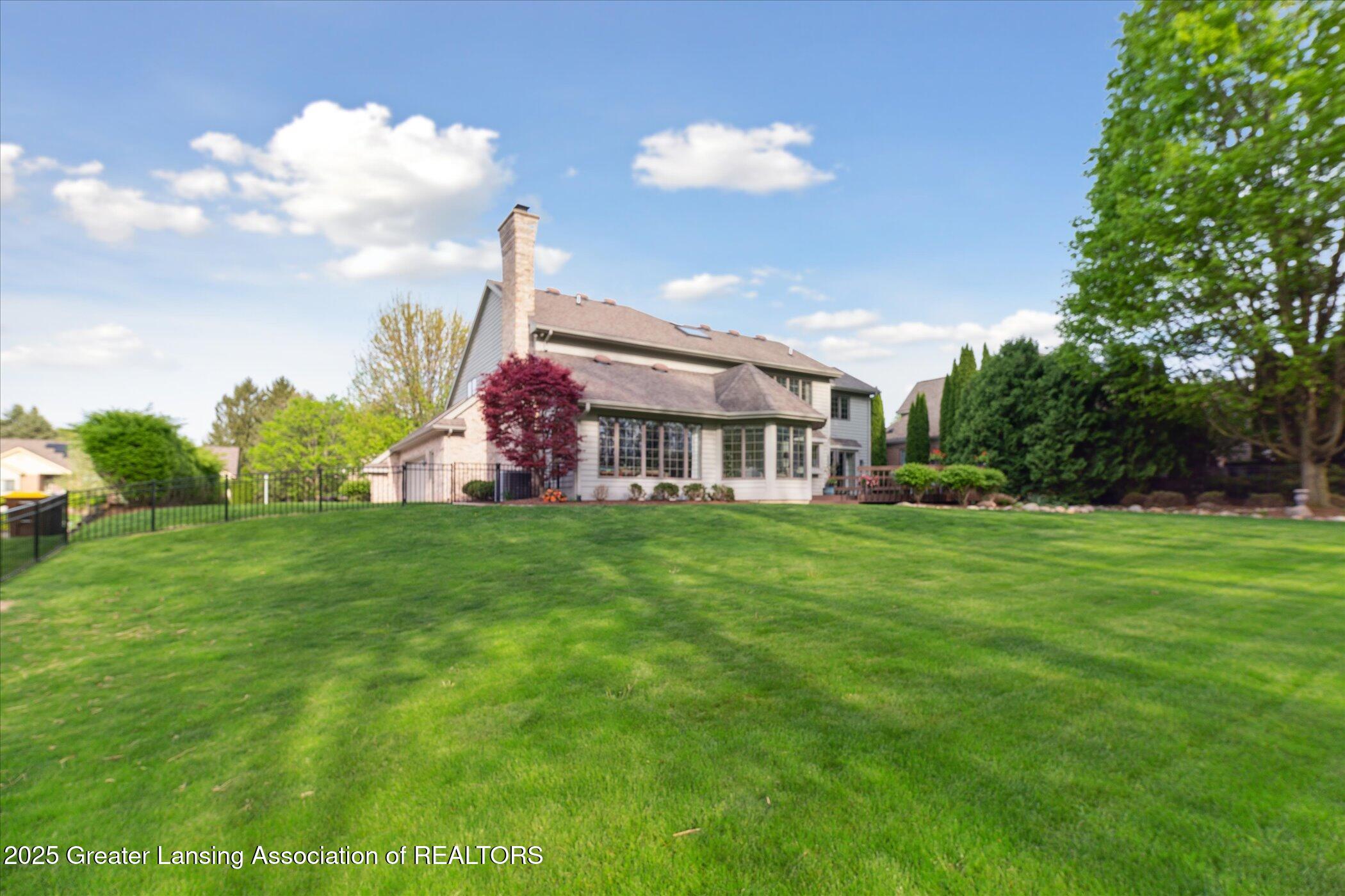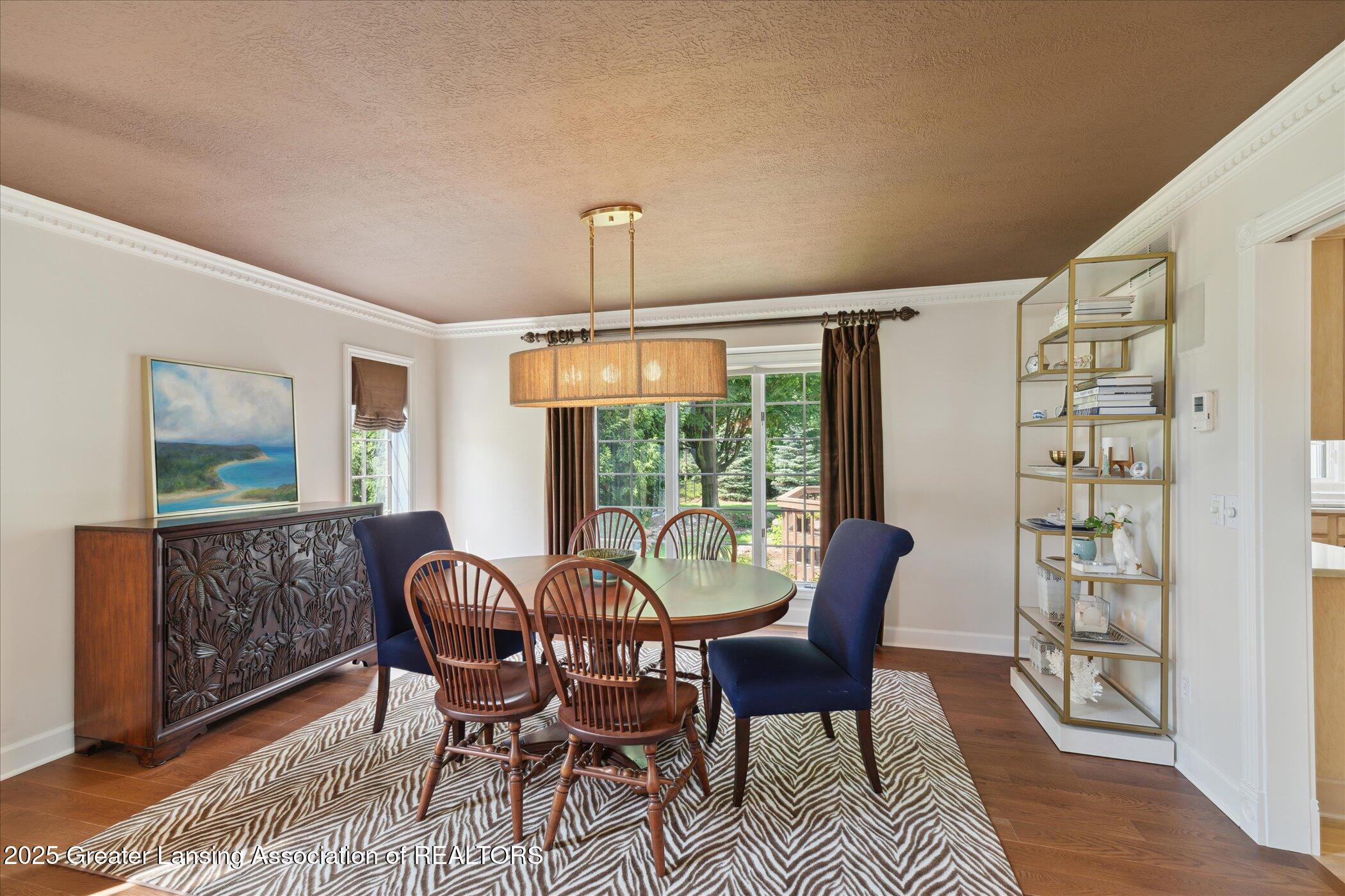 Kitchen opens to informal dining, wet bar, four-seasons room with soaring ceiling and bright light all day, and family room. Family room has custom built-ins, brick fireplace, coved ceiling, custom silk blinds/curtains. Large deck overlooks fully fenced private yard.