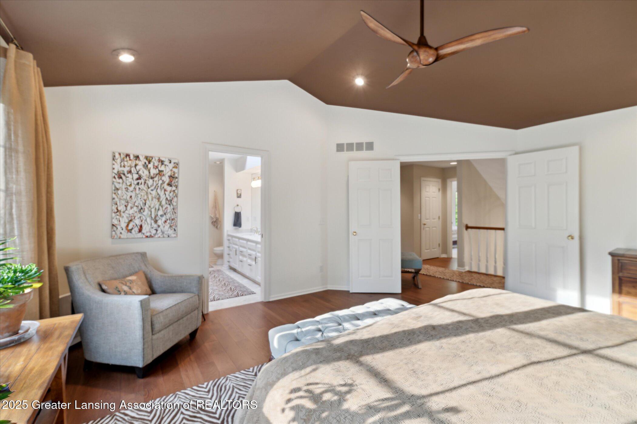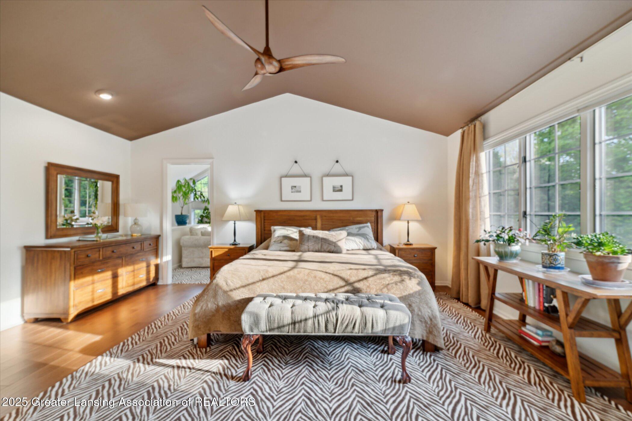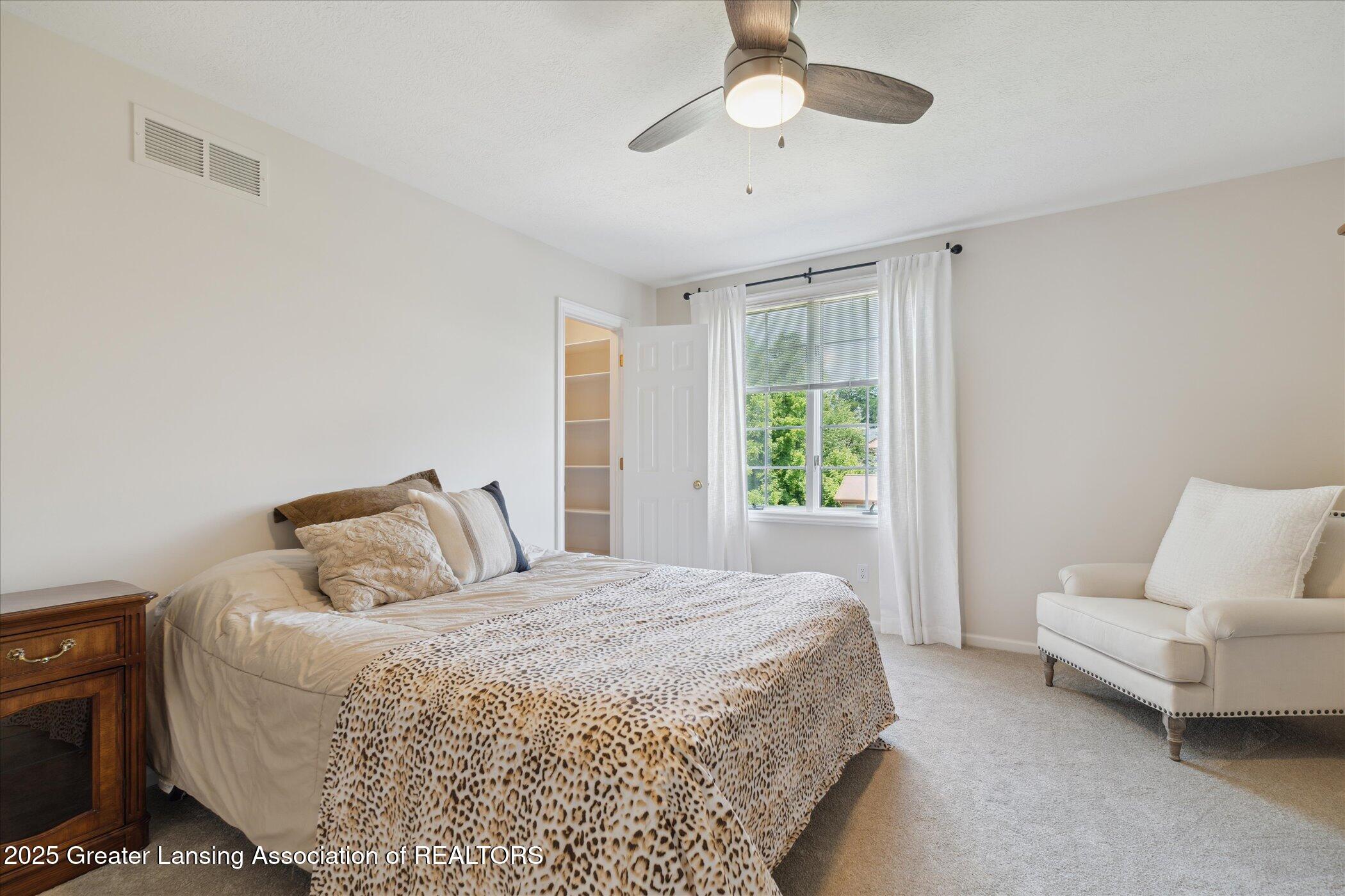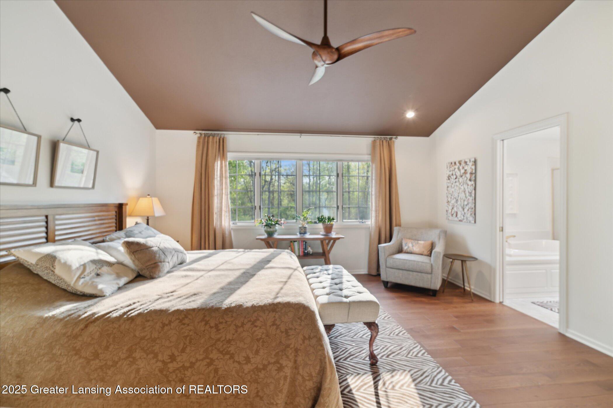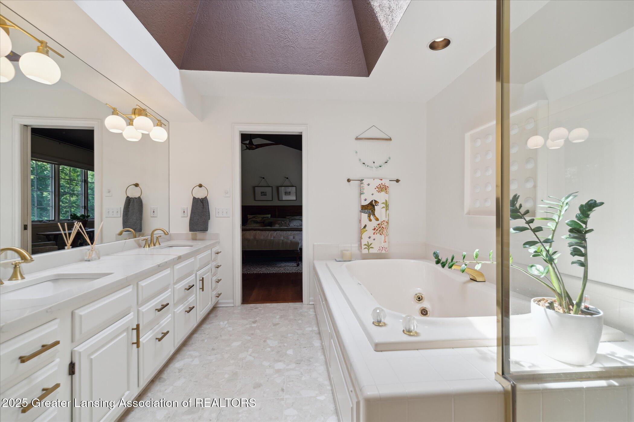 Large master has vaulted ceiling and separate loft, both with large windows, neutral silk blinds. Bath skylight allows tons of natural light, jet tub, tile shower, and full wall vanity mirror. New quartz, sinks, fixtures, and lighting. Three other bedrooms with large walk-ins, new, neutral carpet and paint 6/25. 2nd bath on the 2nd floor has new quartz, sinks, and fixtures 6/25.