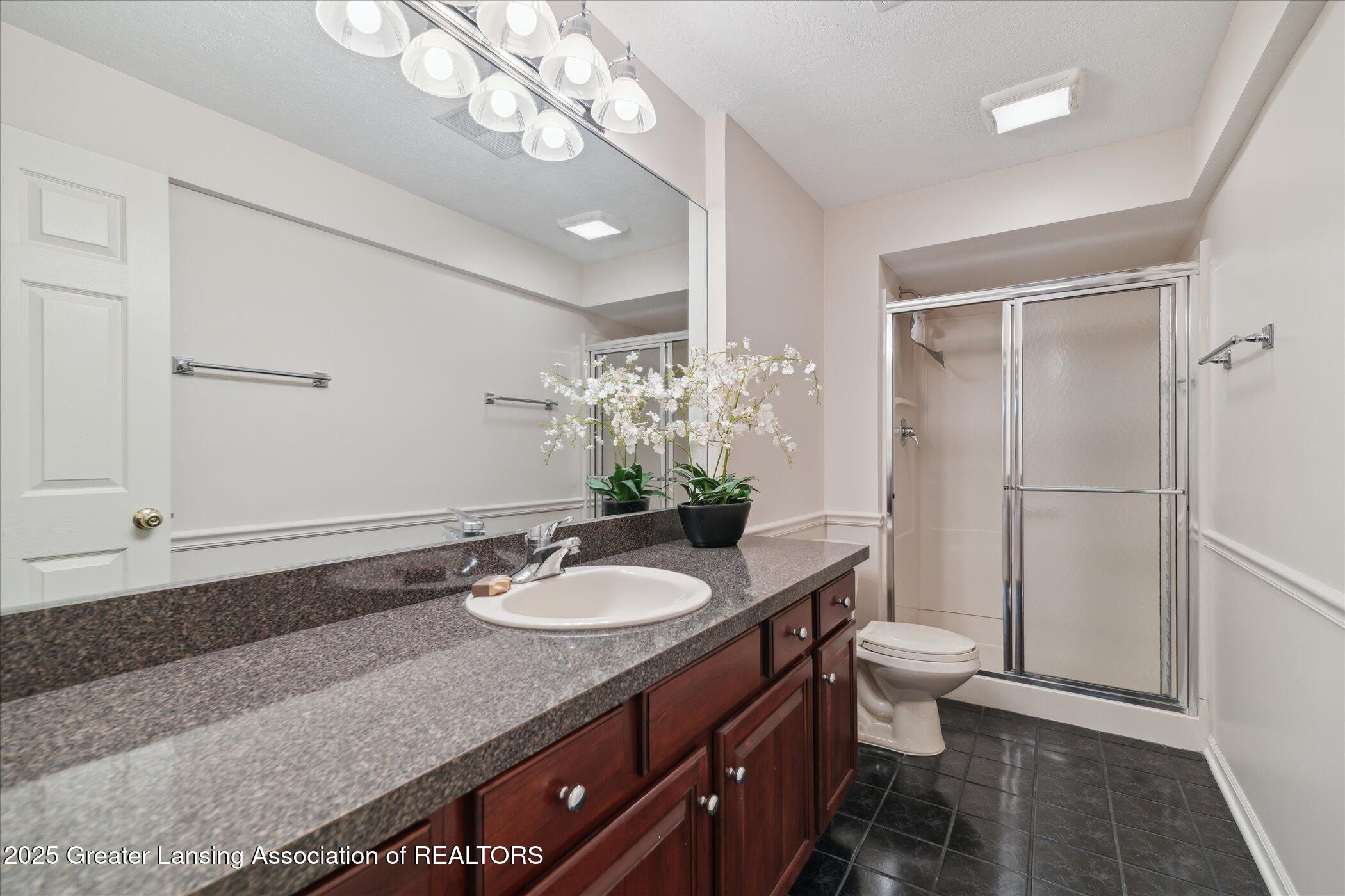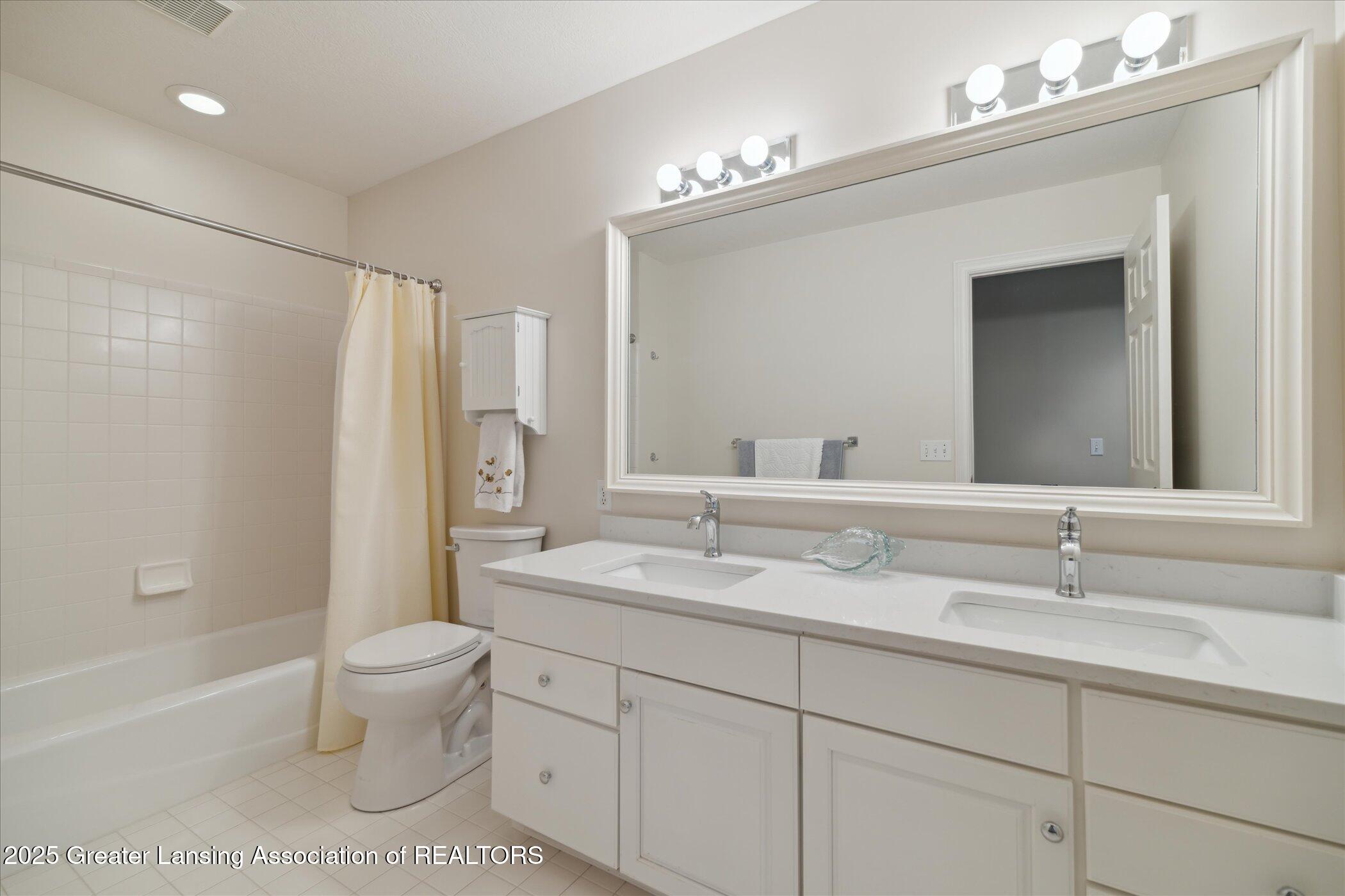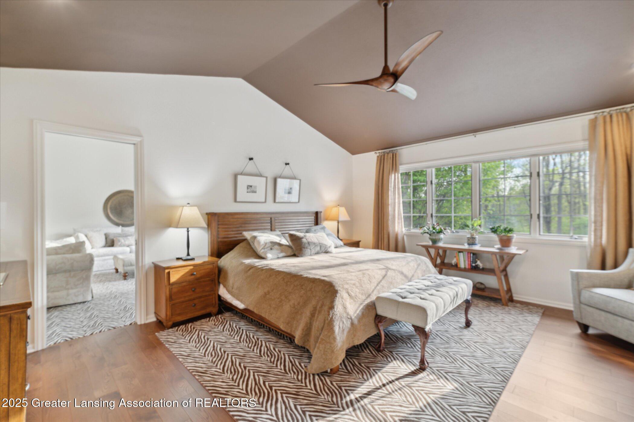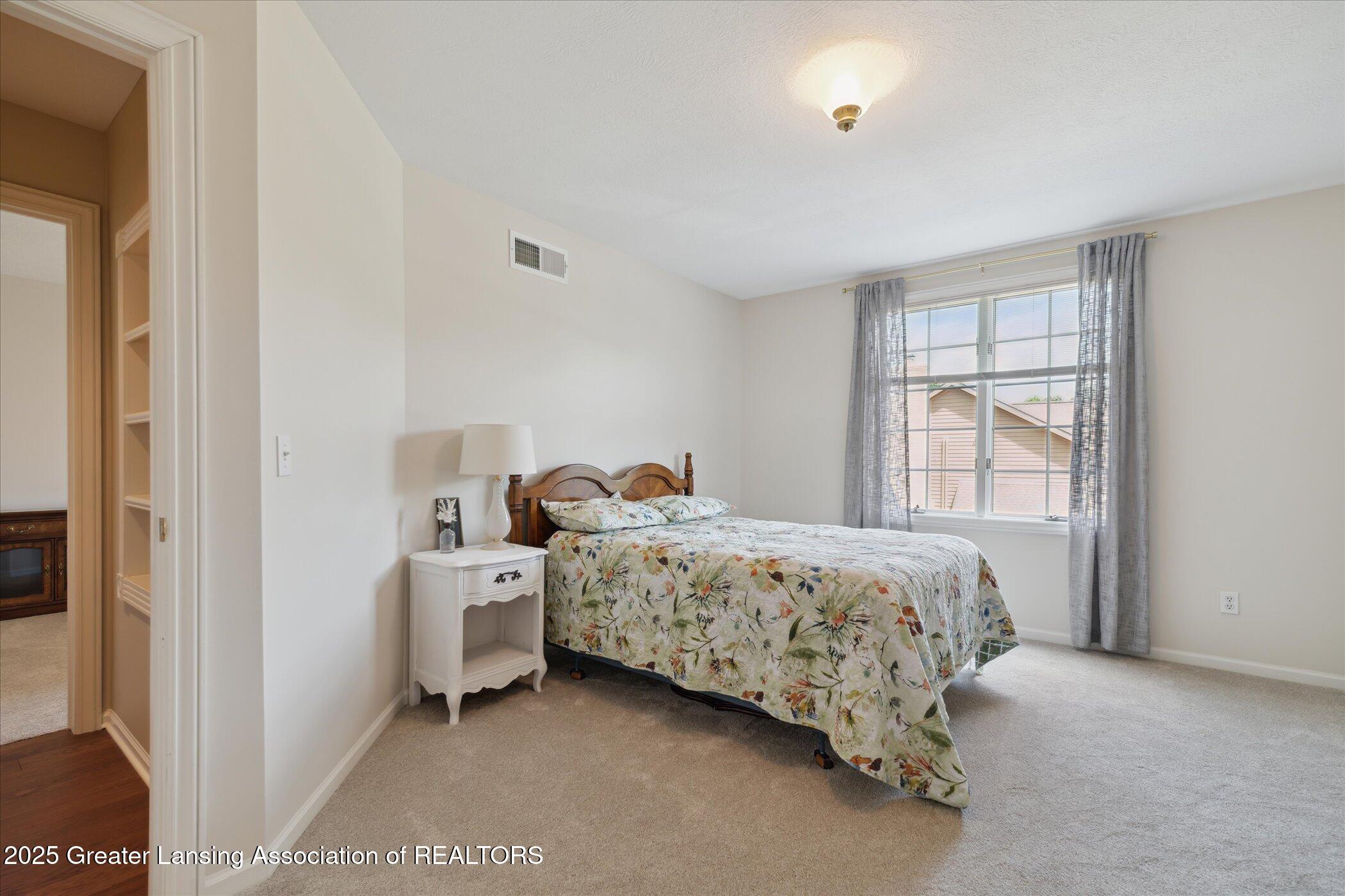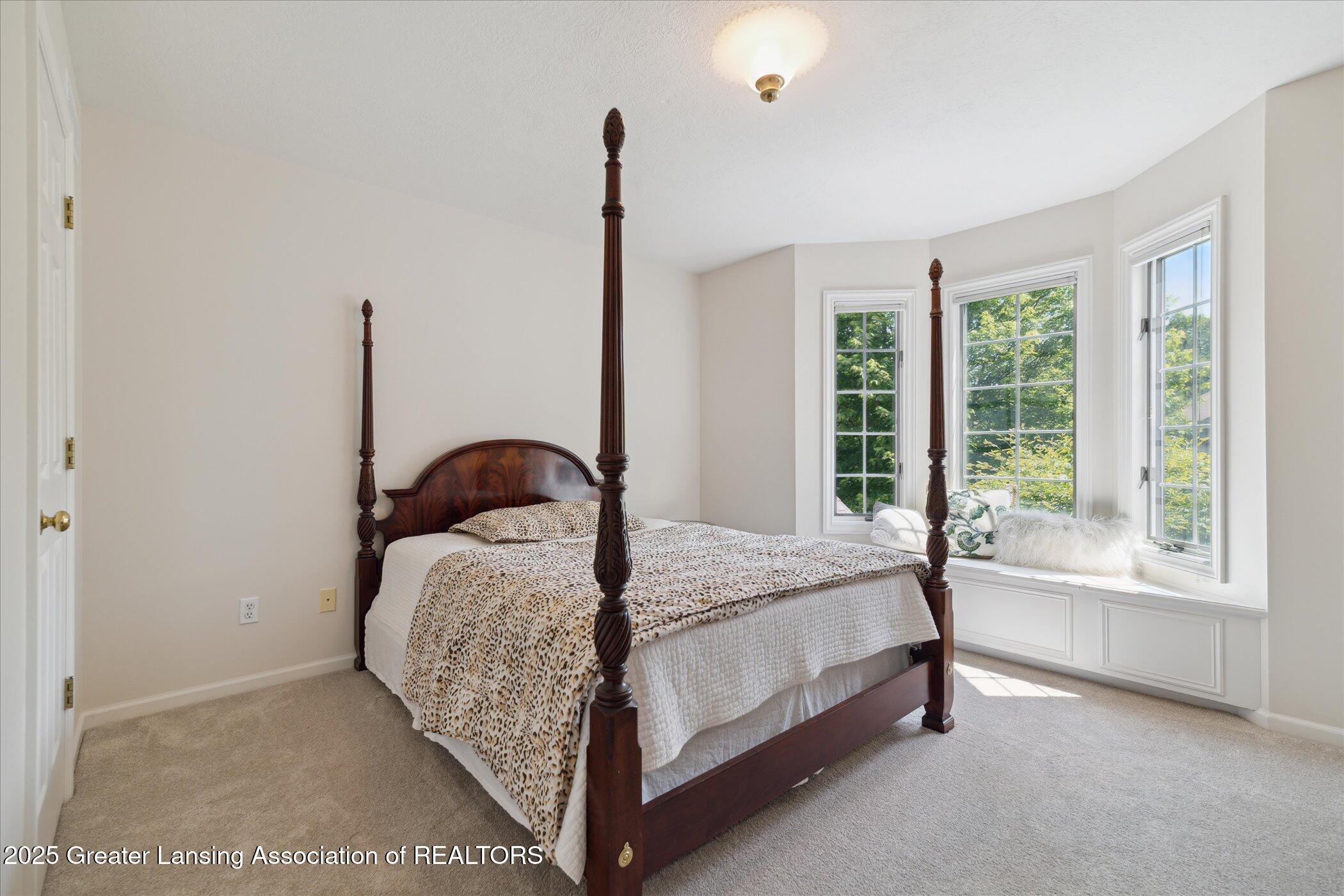 Large master has vaulted ceiling and separate loft, both with large windows, neutral silk blinds. Bath skylight allows tons of natural light, jet tub, tile shower, and full wall vanity mirror. New quartz, sinks, fixtures, and lighting. Three other bedrooms with large walk-ins, new, neutral carpet and paint 6/25. 2nd bath on the 2nd floor has new quartz, sinks, and fixtures 6/25.