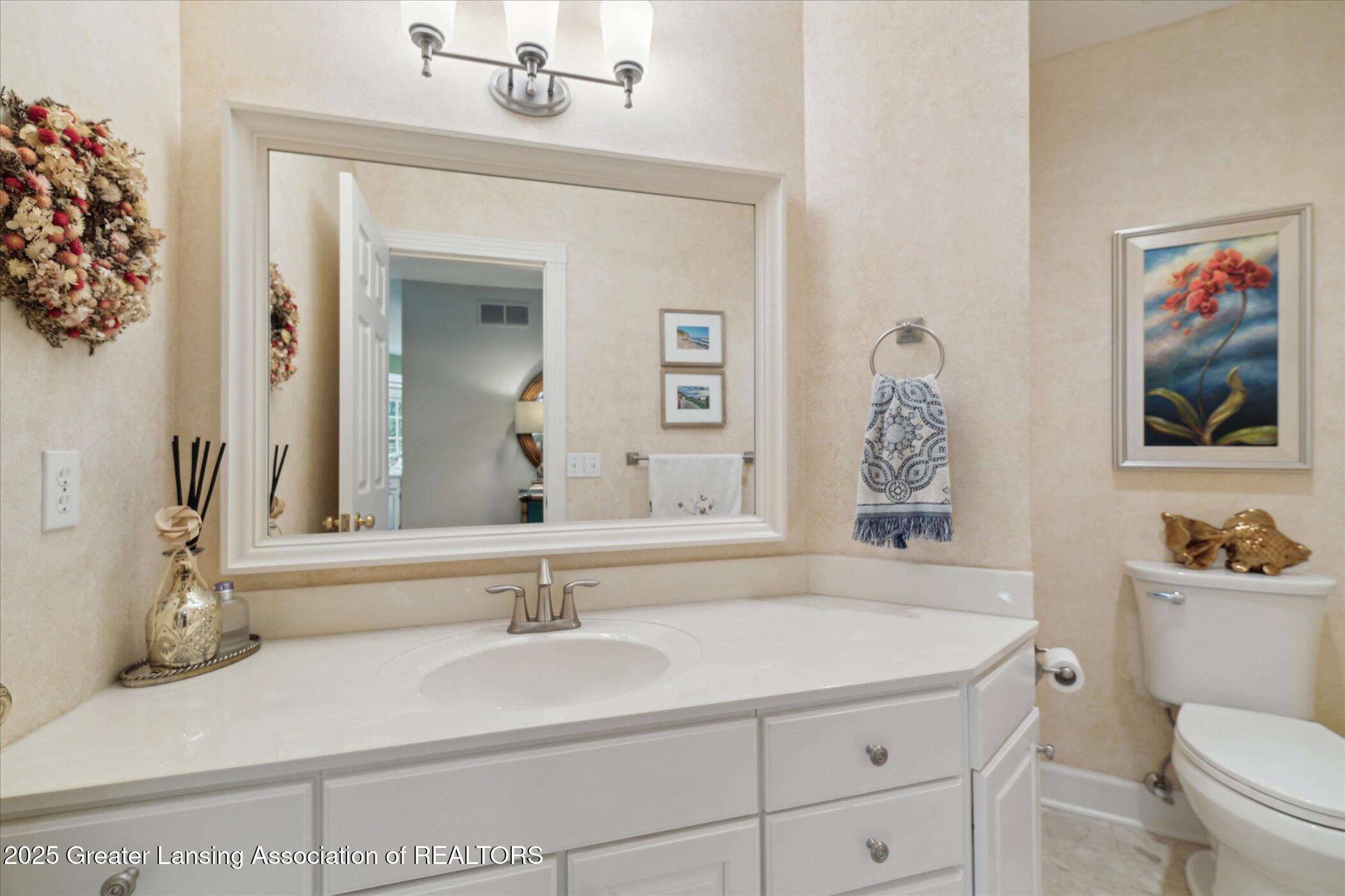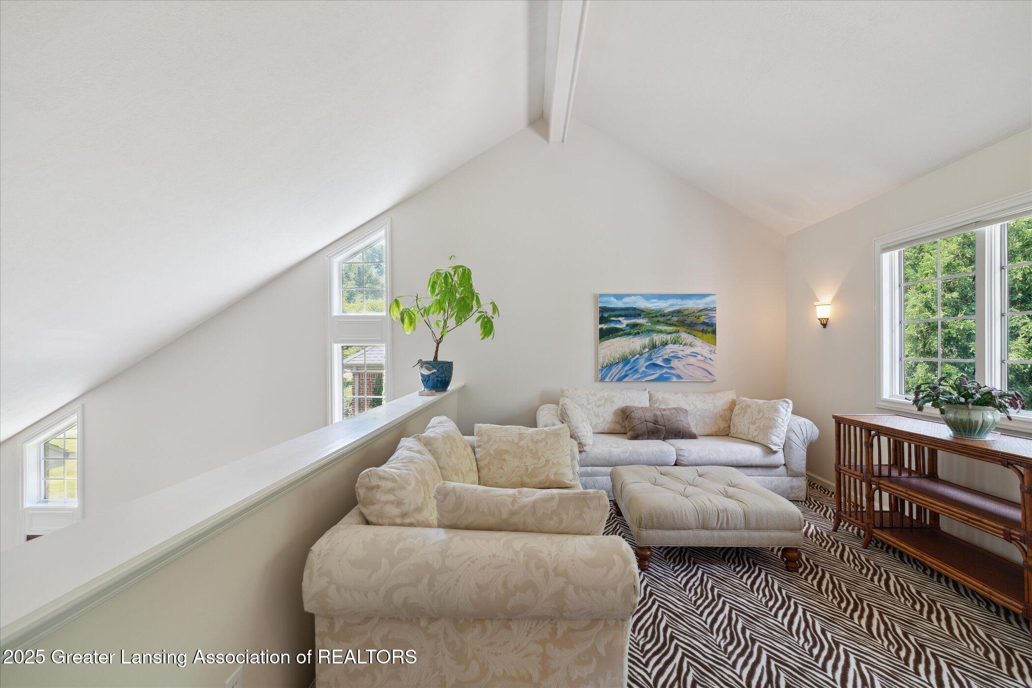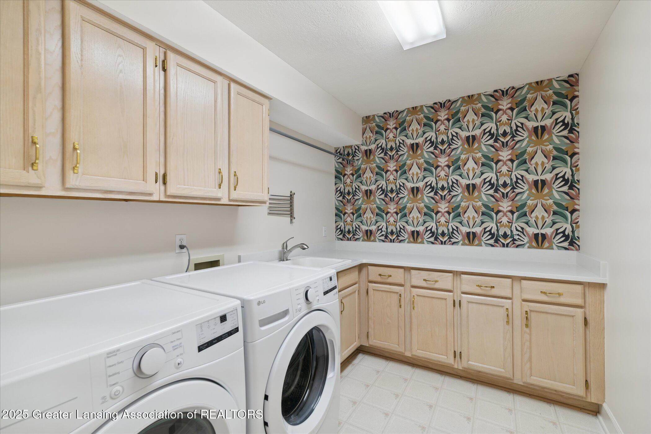 Formal living/dining has cathedral ceiling, separate loft, tons of light, custom silk blinds/curtains. Powder room has full-wall mirror, upscale, neutral wallpaper. Main floor laundry has ample storage, new quartz, sink, and washer/dryer 6/25.