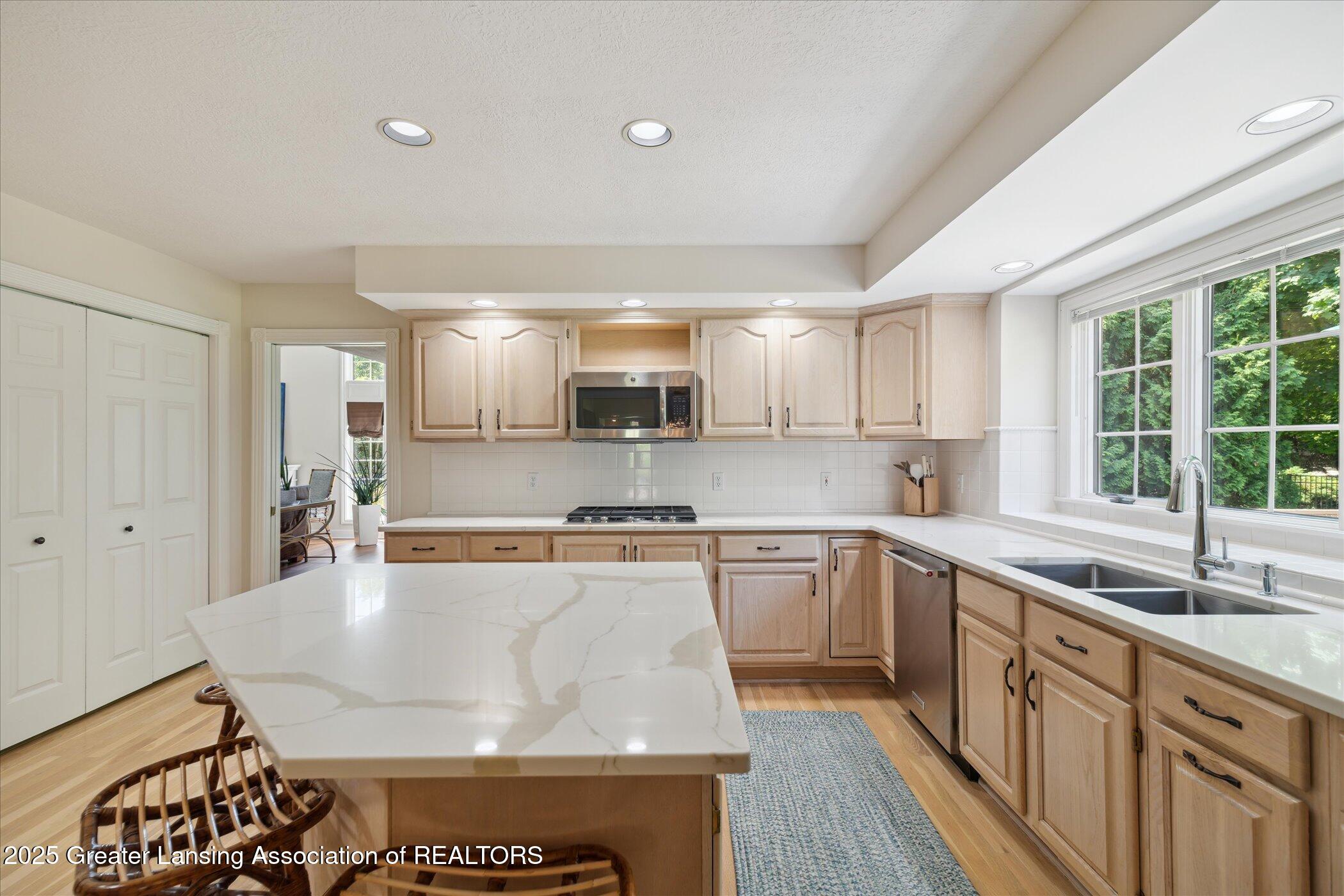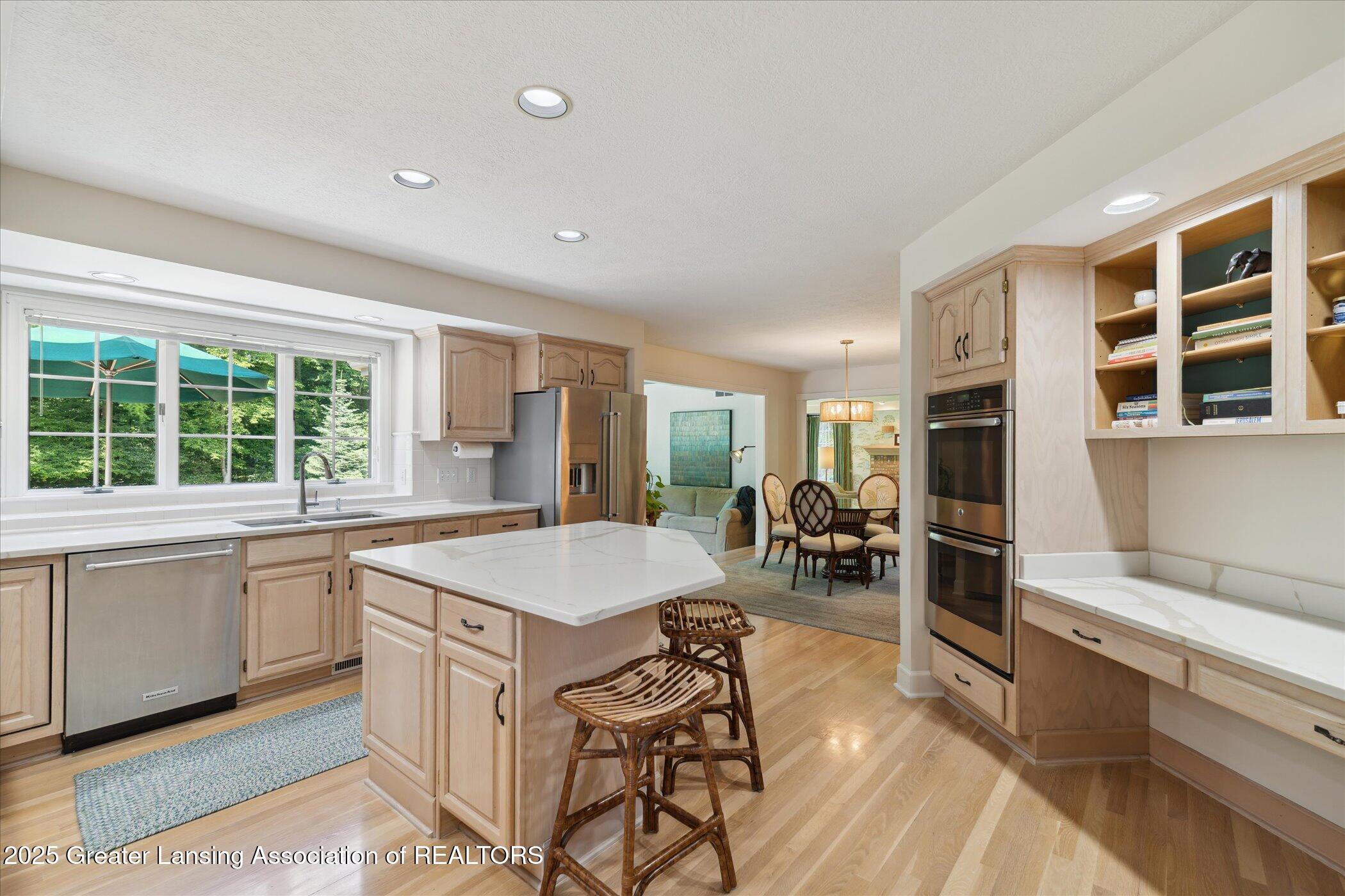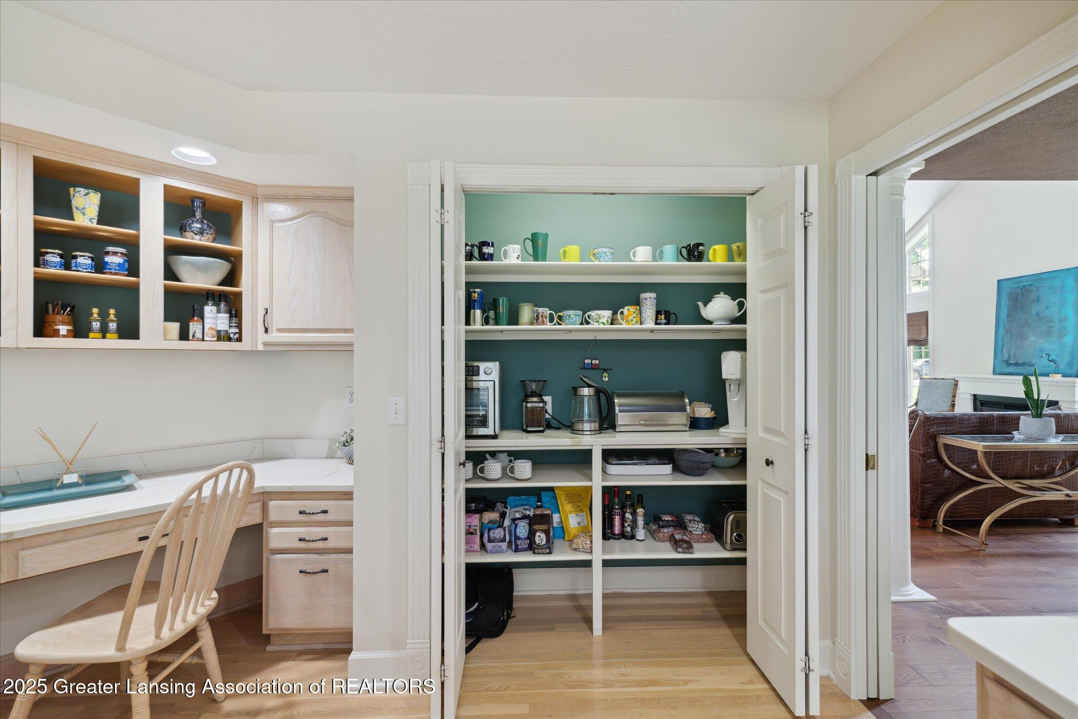 Bright kitchen: stainless-steel appliances, five-burner gas stove, double ovens/convection, new quartz counters, large in-kitchen pantry with electric and quartz counter to store appliances out-of-sight, large separate walk-in pantry, built-in desk.