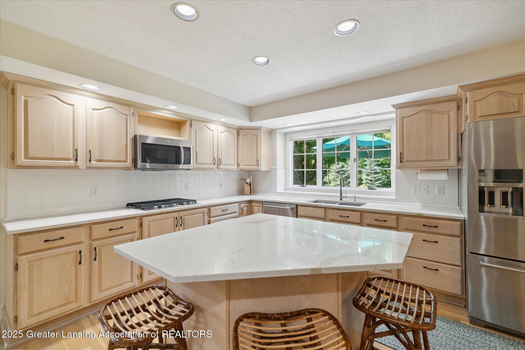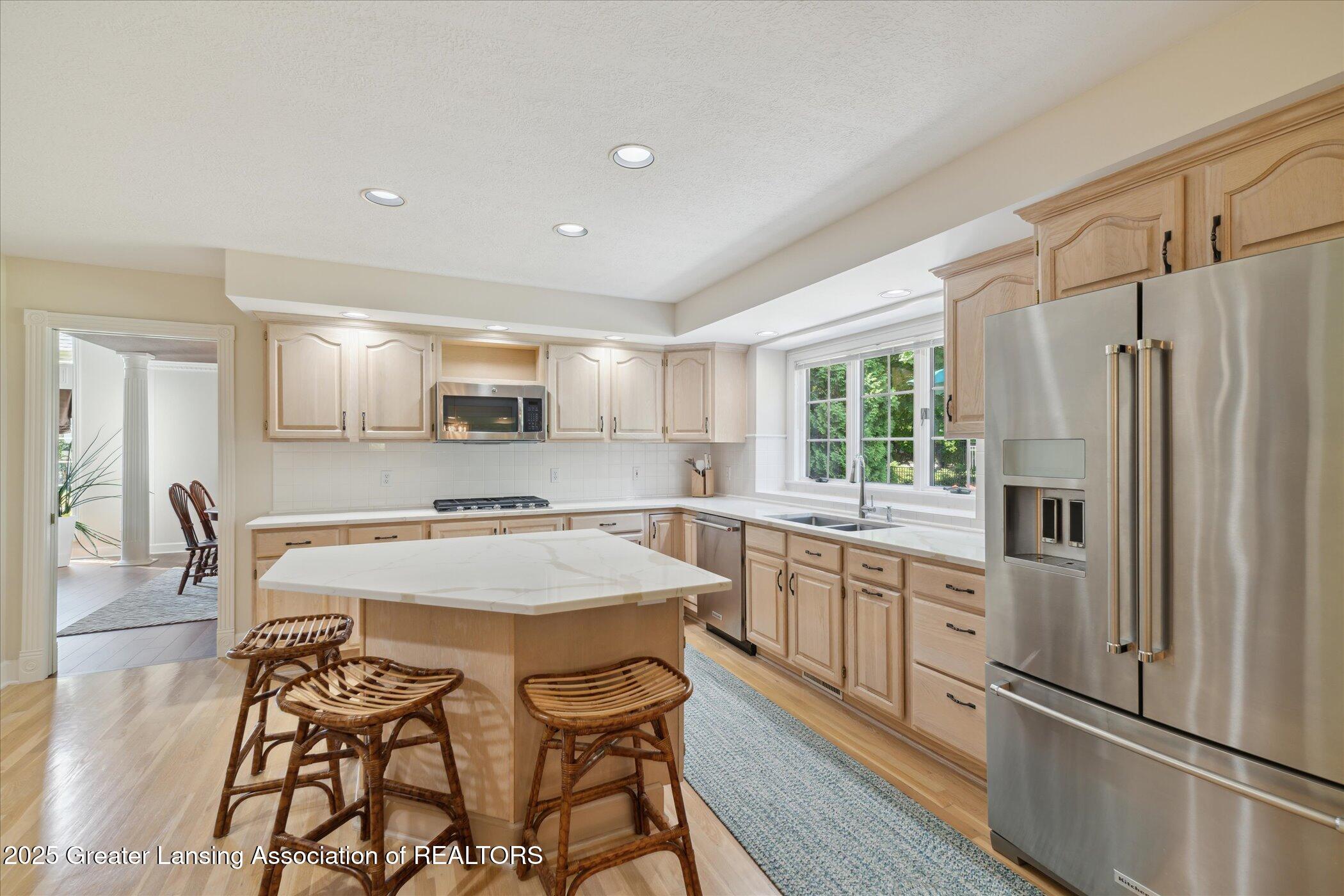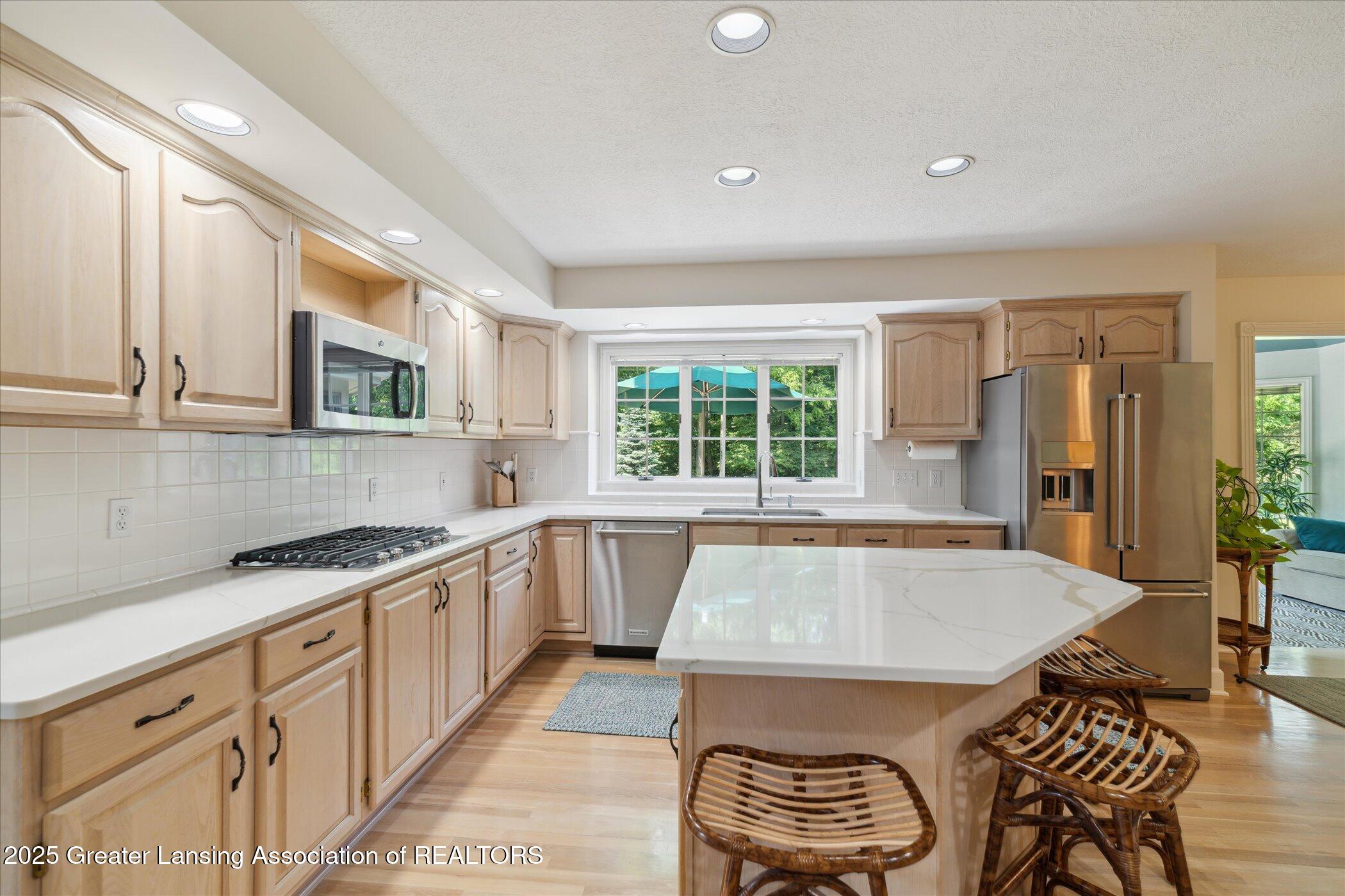 Bright kitchen: stainless-steel appliances, five-burner gas stove, double ovens/convection, new quartz counters, large in-kitchen pantry with electric and quartz counter to store appliances out-of-sight, large separate walk-in pantry, built-in desk.