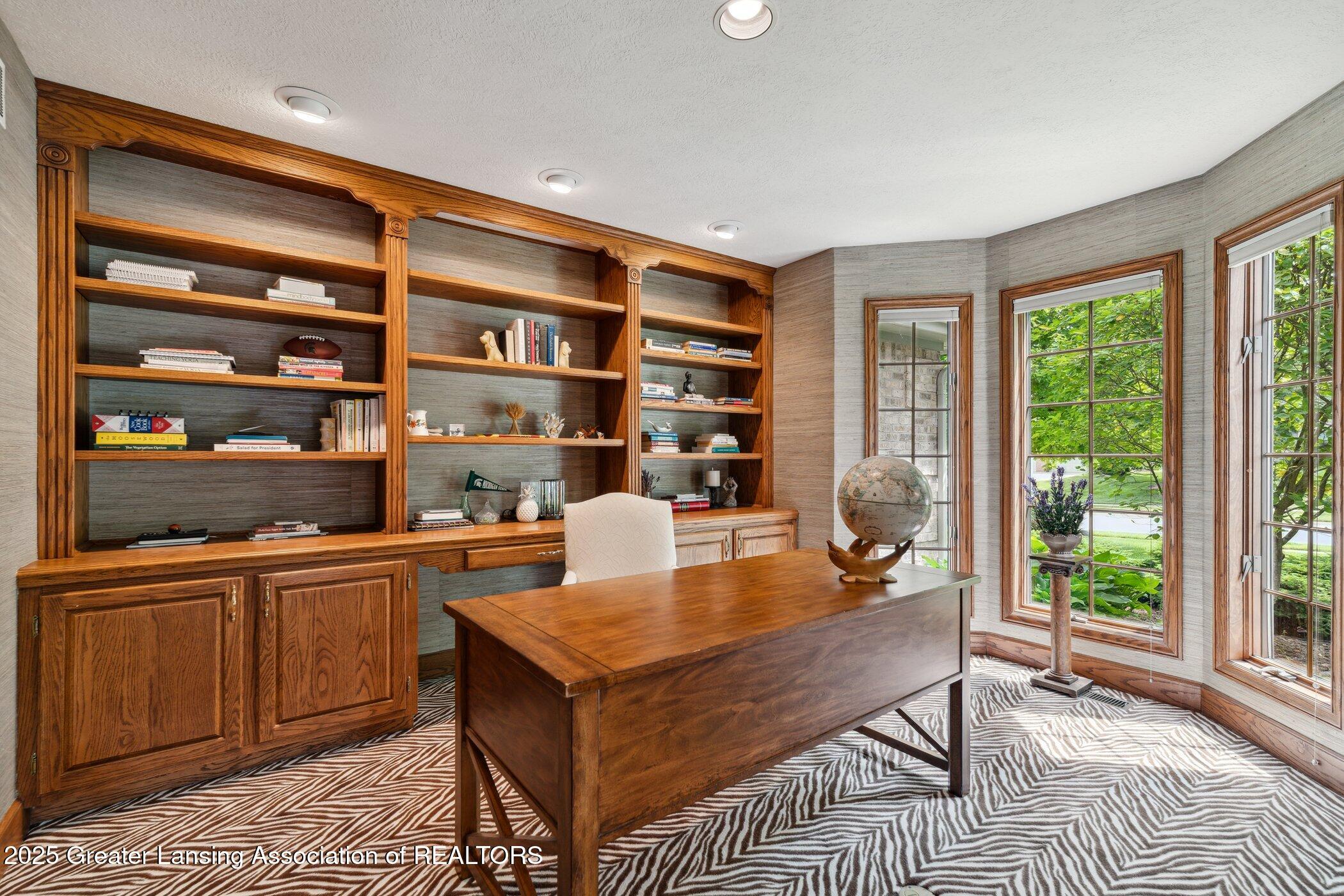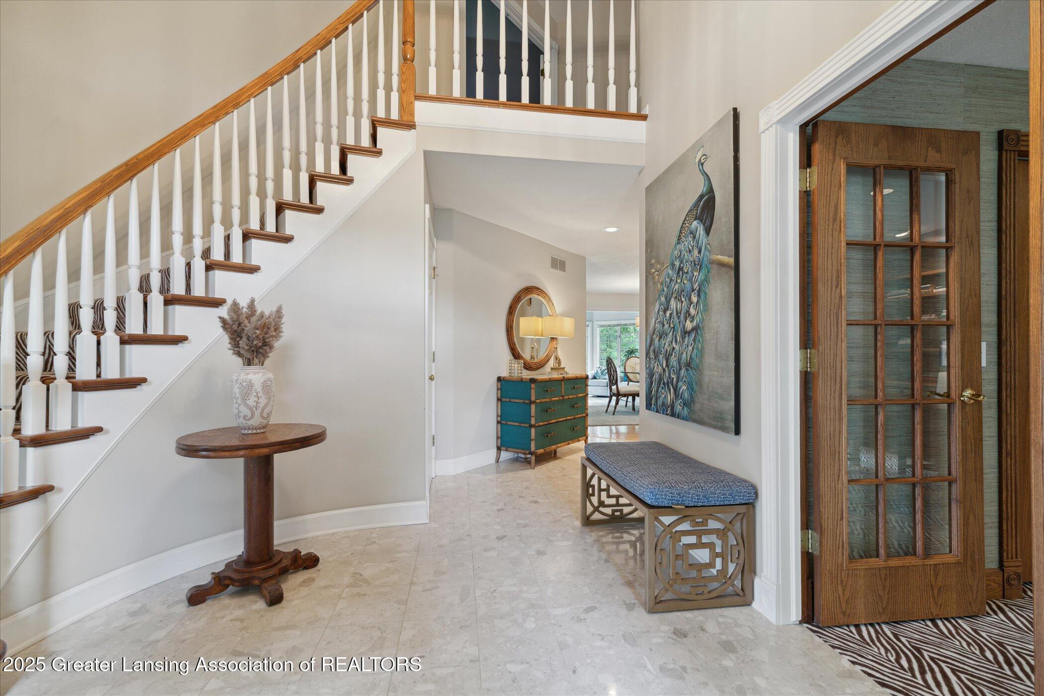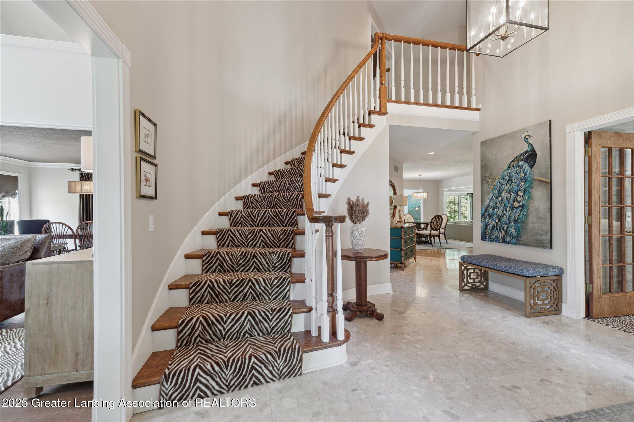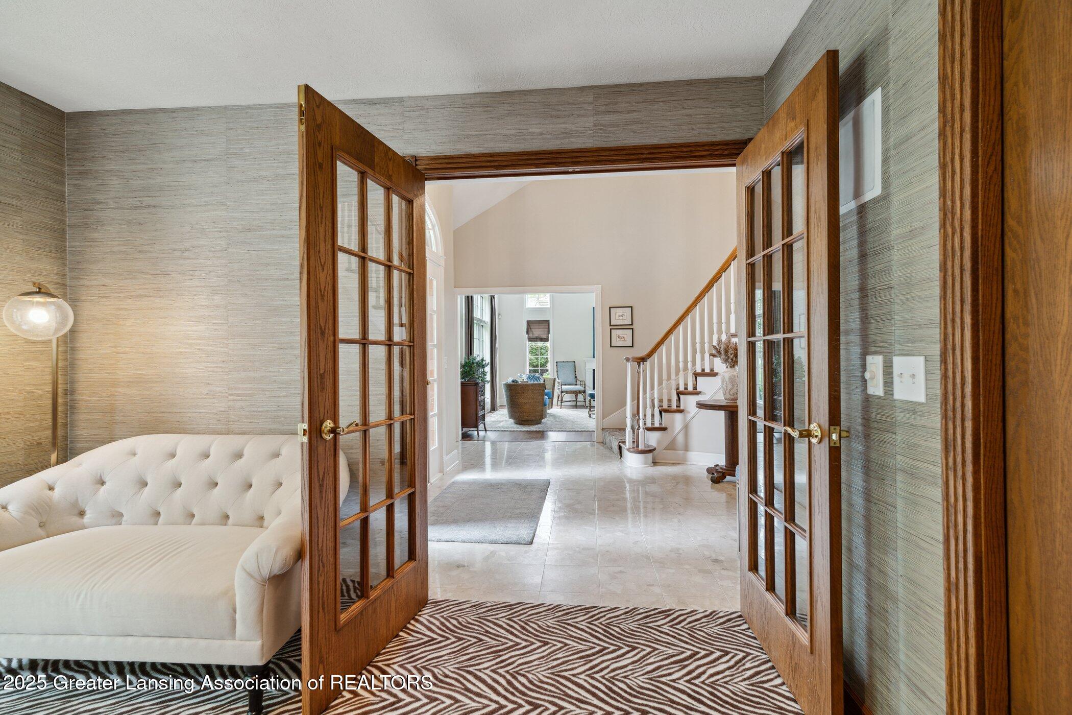 Custom wood entry door with sidelights and sunrise top brims with morning sun. Large foyer with curved staircase opens to office with custom built-ins, bay window, neutral silk blinds.