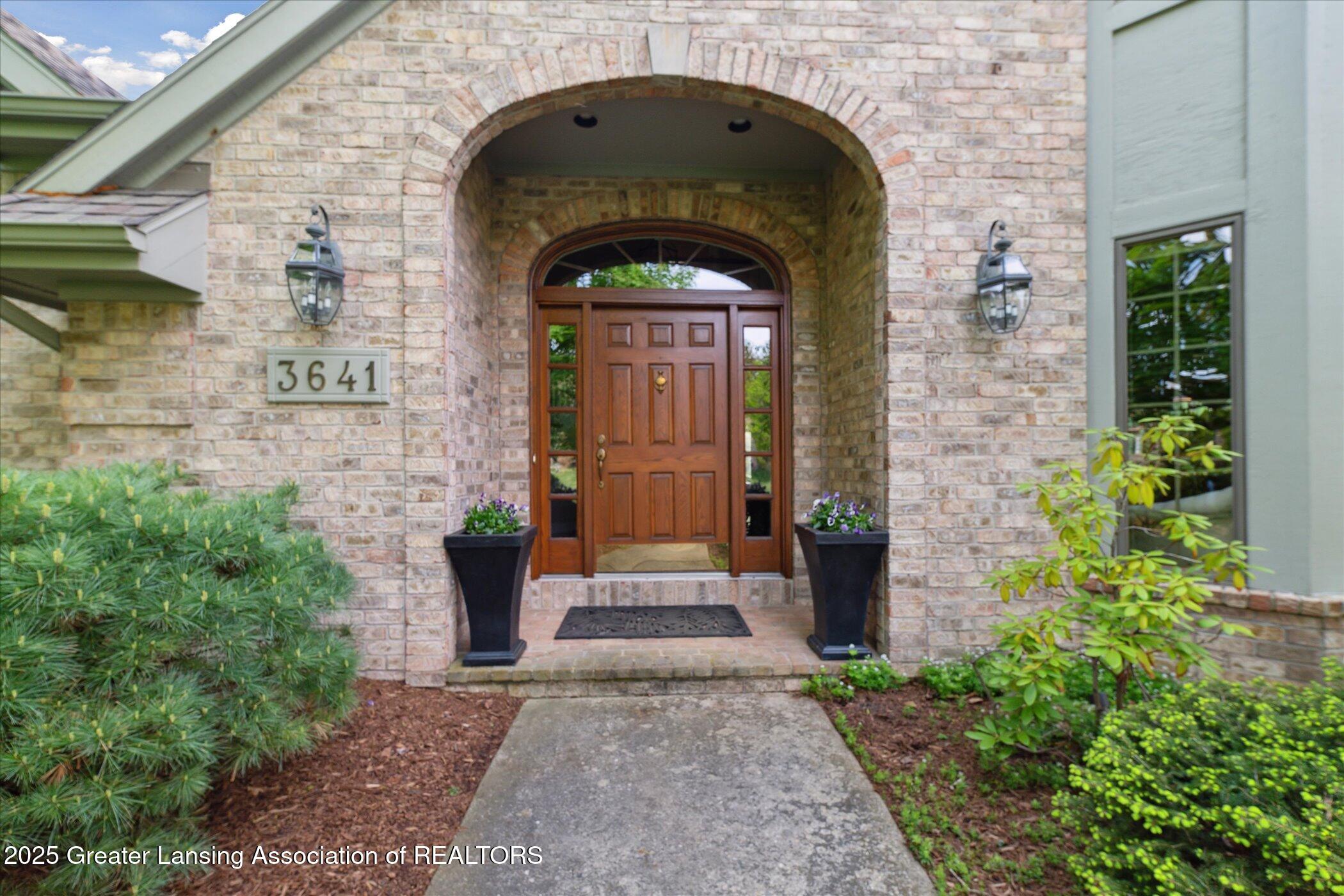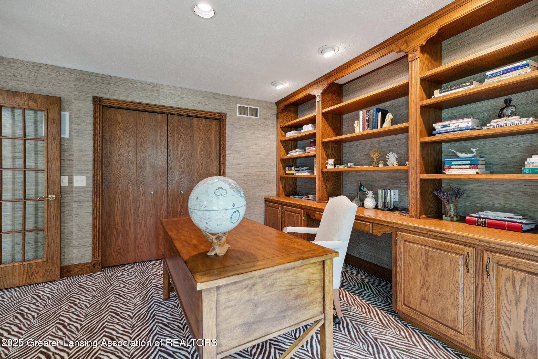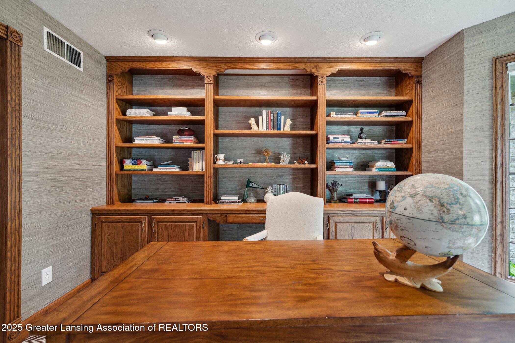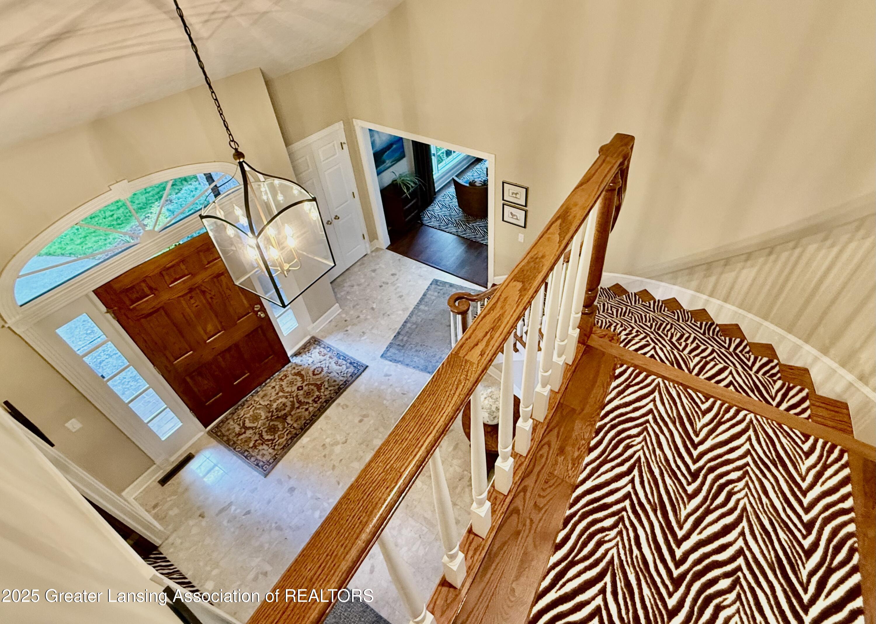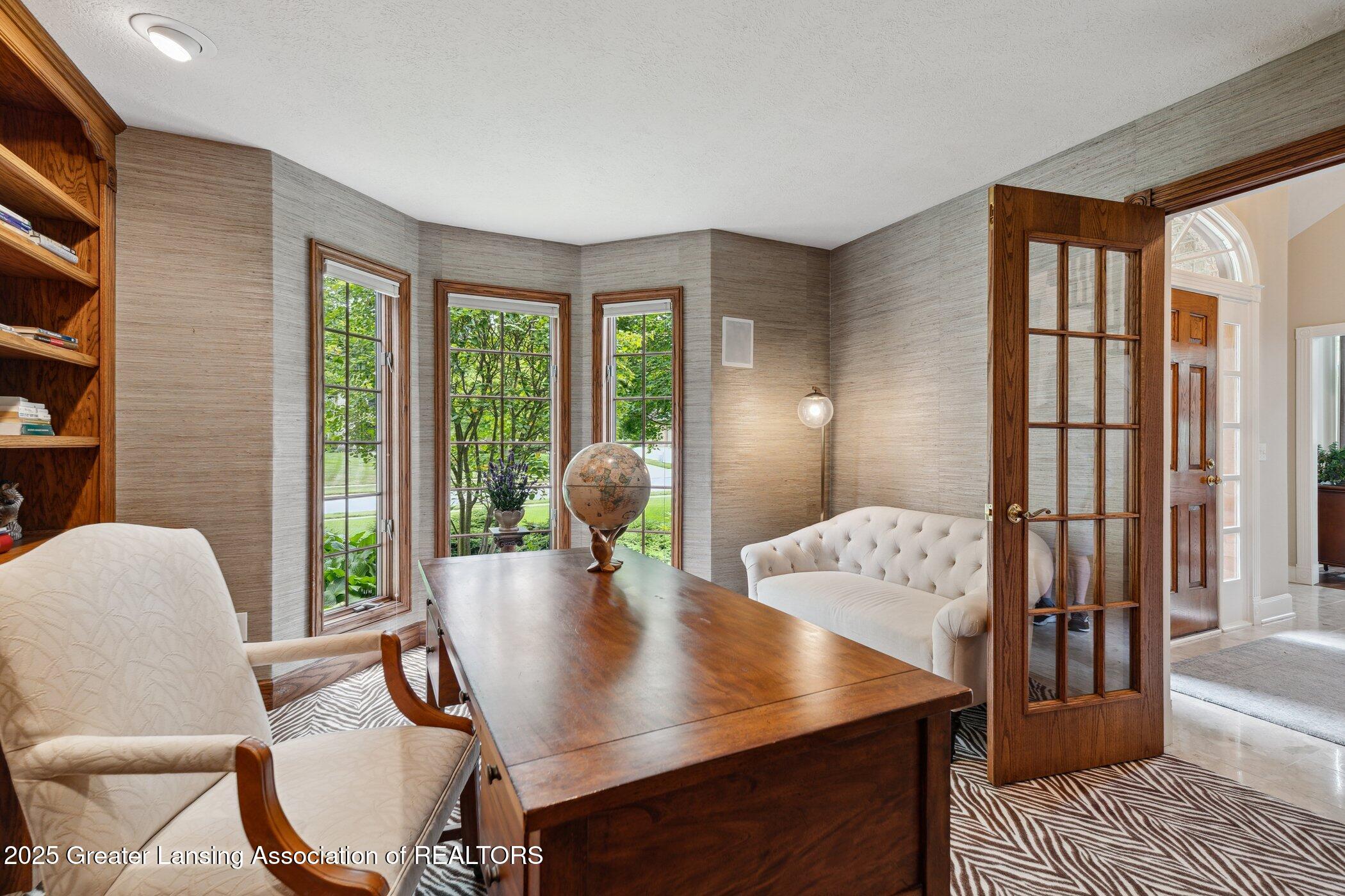 Custom wood entry door with sidelights and sunrise top brims with morning sun. Large foyer with curved staircase opens to office with custom built-ins, bay window, neutral silk blinds.