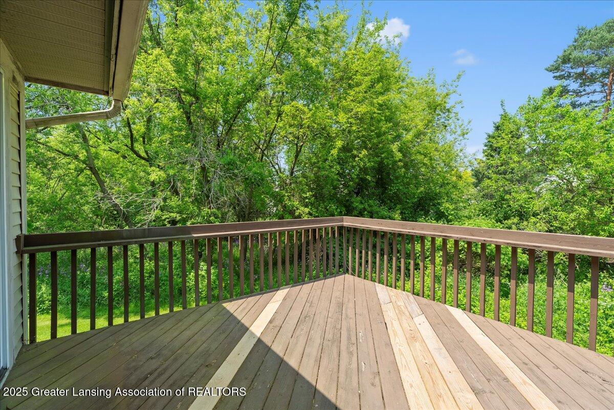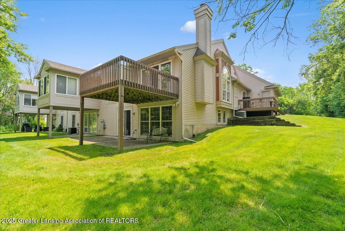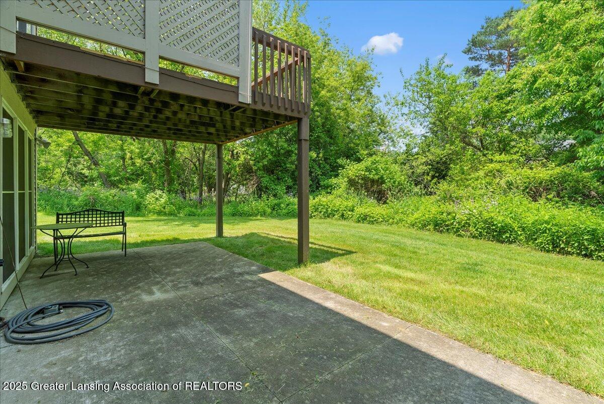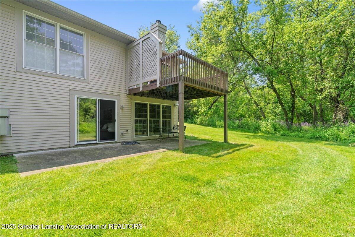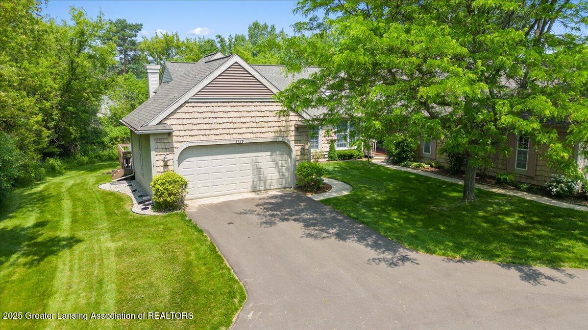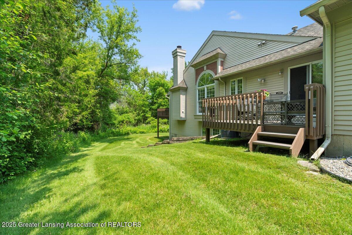 Welcome 5629 Bayonne Ave in Haslett, a private, peaceful 3-bedroom, 2.5-bath condo in the highly desirable Pine Creek community. Perfectly positioned at the end of a long driveway, this end-unit offers rare seclusion with wooded views on two sides, lush green space in front, and multiple decks for enjoying the scenery. Inside, you'll love the airy feel created by vaulted ceilings, abundant natural light, and a thoughtful layout. The main level includes a versatile front study with a full-size closet and direct access to the half bath, ideal as a home office or easily transformed into a 4th bedroom. The spacious primary suite boasts a luxurious en-suite bath with a large soaking tub, walk-in shower, and ample storage. A convenient stacked washer and dryer on the main floor handles everyday laundry, while full-size units on the lower level are perfect for larger loads. The finished walk-out lower level adds exceptional living space with a cozy family room (featuring a second fireplace), two generous bedrooms, a full bath with walk-in shower, a large laundry room with utility tub, and a bonus storage room with built-in shelving. Step outside to a private backyard patio or explore the nearby nature trail just a half block away, a favorite for dog walks and peaceful strolls. Don't miss your chance to own this hidden gem with the perfect blend of comfort, flexibility, and privacy. Schedule your showing today!